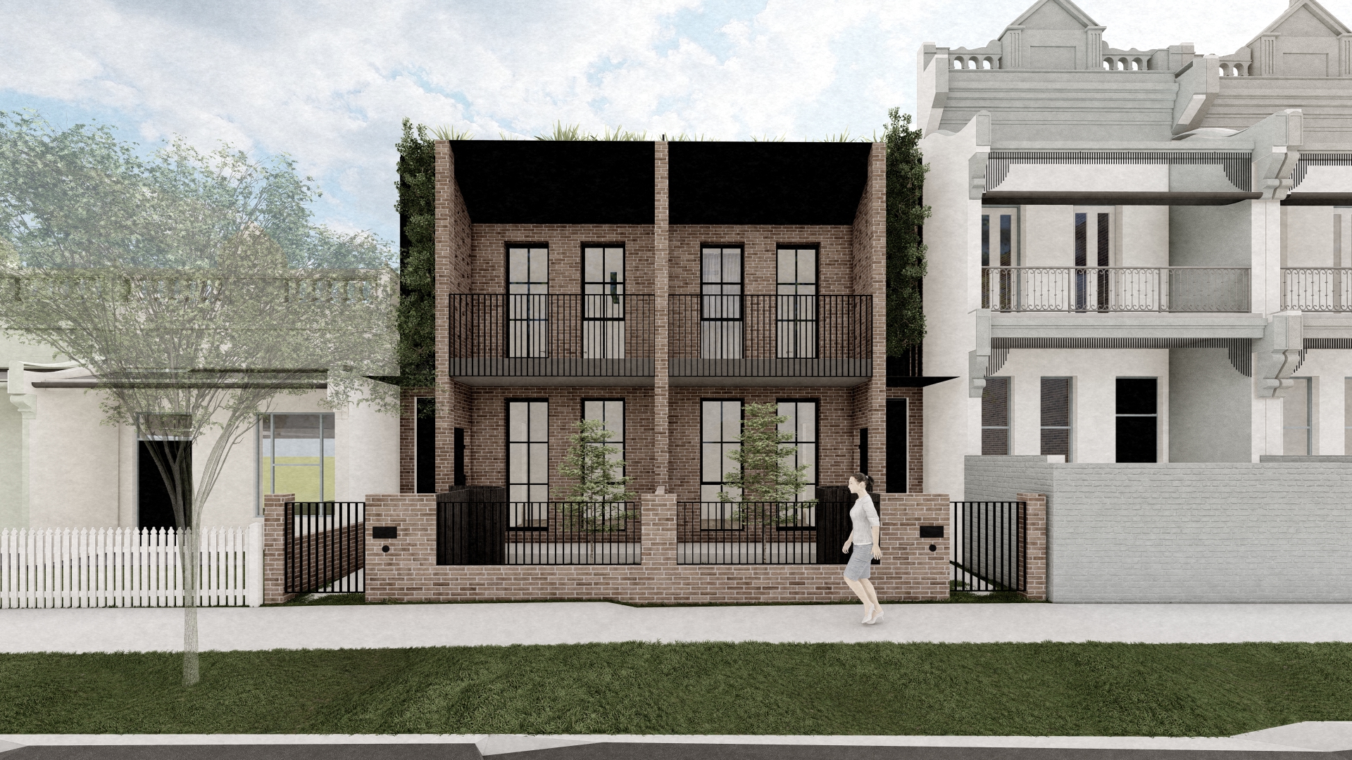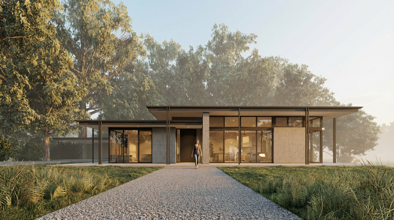 photorealistic architectural rendering of a contemporary australian rural home enhancing an existing lumion base image introduce soft atmospheric depth abundant natural light with a warm low angle sun early morning or late afternoon creating gentle highlights and soft shadows the front of the building needs direct sunlight on an oblique angle refine materiality to feel tactile and true to life concrete with natural texture and depth metal with subtle reflectivity and imperfections glazing with realistic reflections and slight interior transparencyadd understated warm interior lighting 2700k 3000k to create a soft glow from ensuring it feels natural and not overexposed balance interior and exterior lighting so neither dominates enhance landscaping with slight movement and realism softened edges and subtle tonal variation in grasses and foliage introduce light environmental effects e g faint haze diffused background to increase depth and atmosphere overall mood should be warm calm and evocative slightly ethereal but grounded in realism avoid overly dramatic contrast or stylisation aim for a premium architectural photography aesthetic with a cinematic softness replace the 2d figure with a woman with motion blur