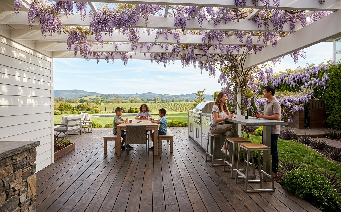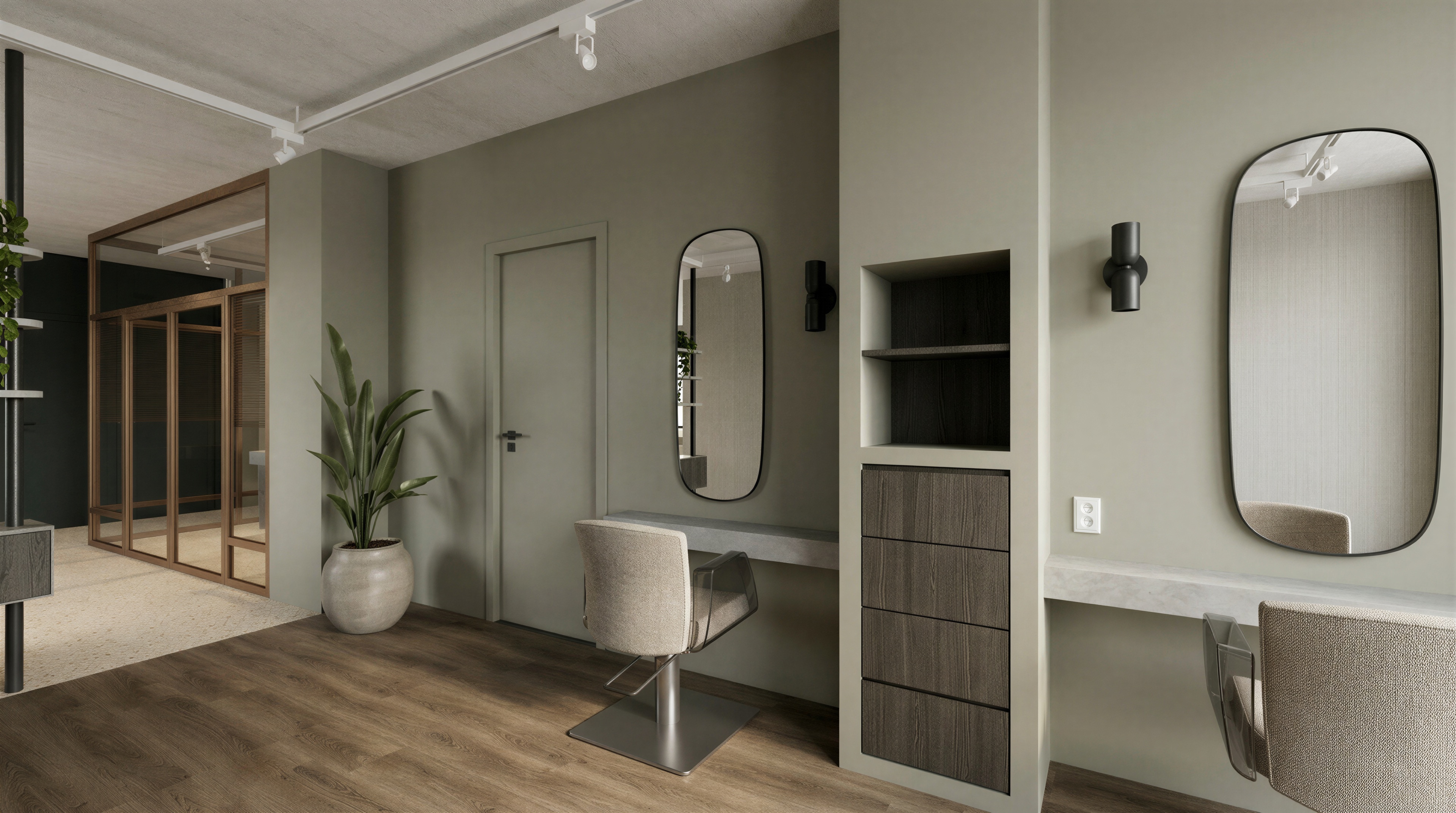 photorealistic interior render of a high end hair salon soft natural daylight and professional studio lighting the main walls and the built in column cabinet are painted in little greene portland stone deep muted warm grey green the custom cabinet features shelving in pava lavasteen monza wood dark textured wood the styling stations have thin countertops made of light grey beton cire microcement the foreground floor is decolegno sable ls92 warm textured wood plank transitioning in the background to a beige terrazzo floor with fine aggregates two styling chairs upholstered in verotex barbuda pro 24 fabric soft textured weave on the left a large glass partition with elegant bronze metal frames the wall behind the bronze frames is painted in little greene attic ii deep dark tone the ceiling has a light raw concrete look with a white track lighting system and white spotlights small details black minimalist wall sconces next to oval mirrors white electrical sockets and a black metal structural pipe on the far left reflection in the oval mirrors shows the opposite wall covered in vescom palena 1070 17 wallpaper subtle linear texture high end finish 8k resolution architectural photography style