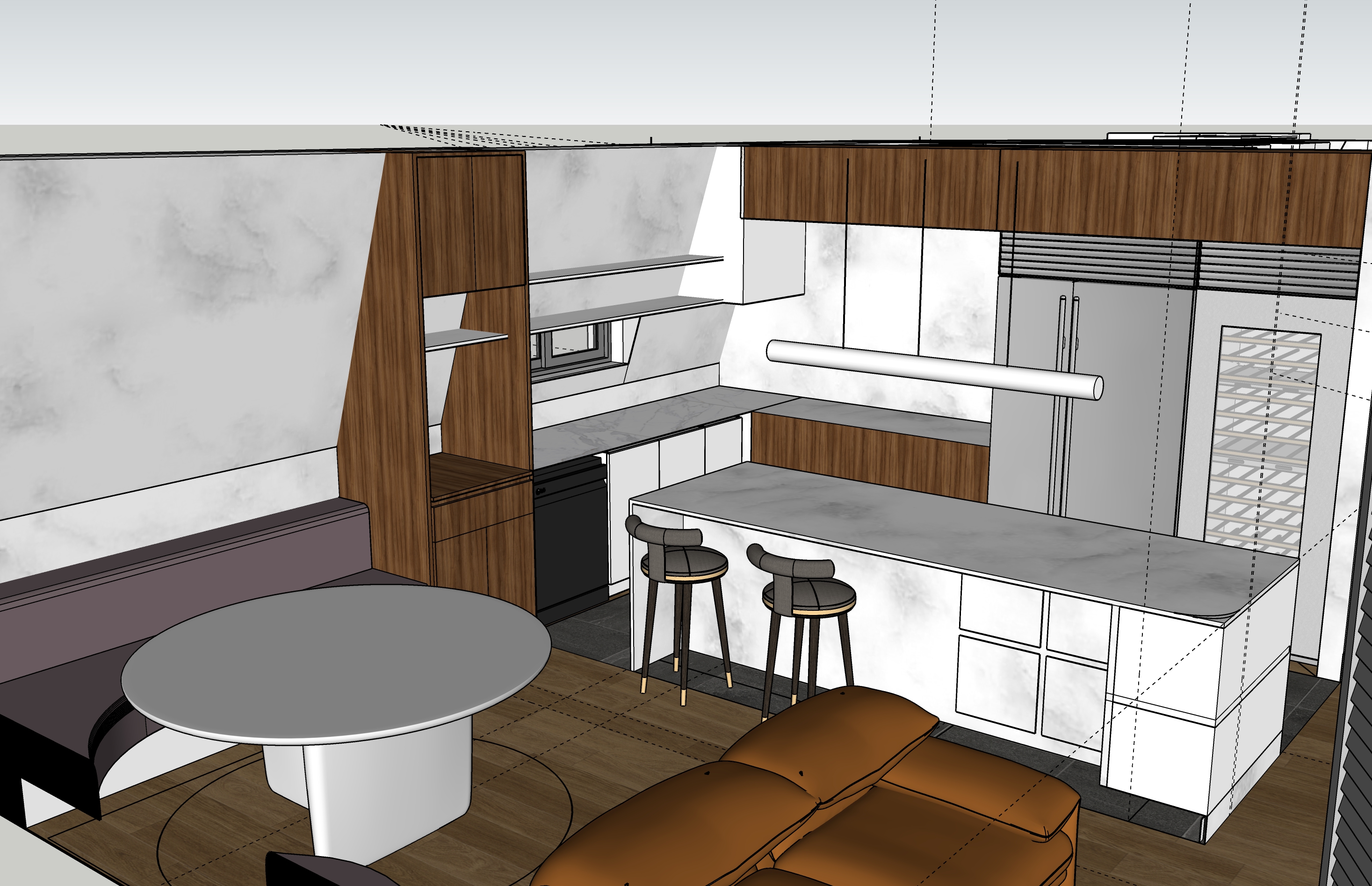 warm white kitchen with a light marble countertops on a sunny day
