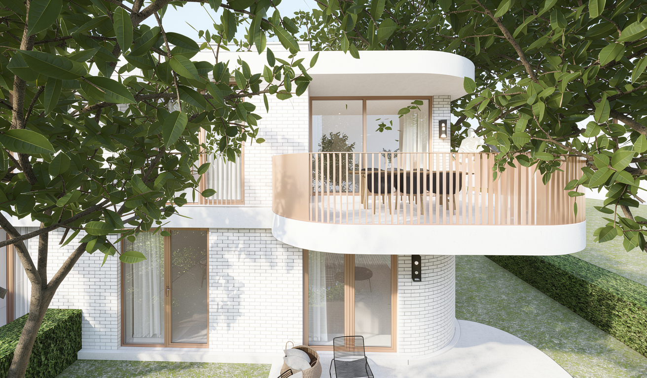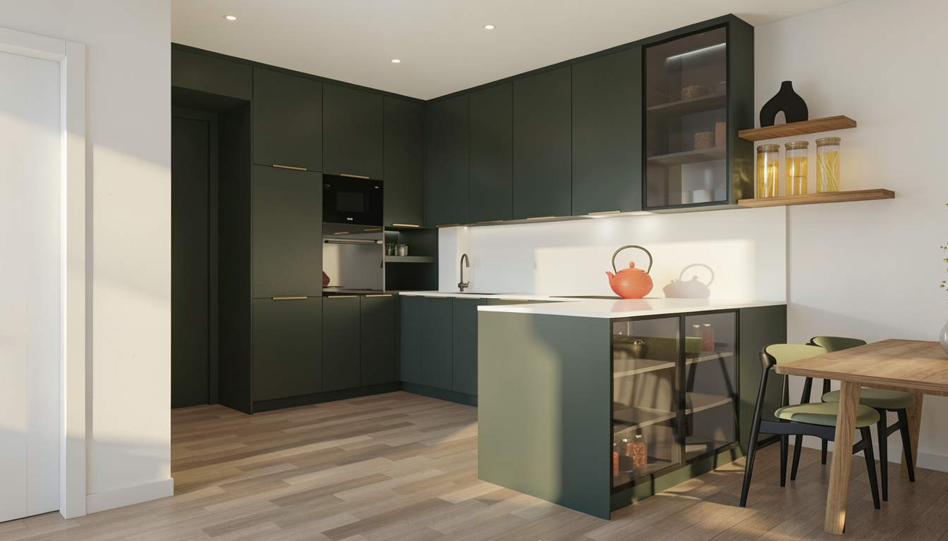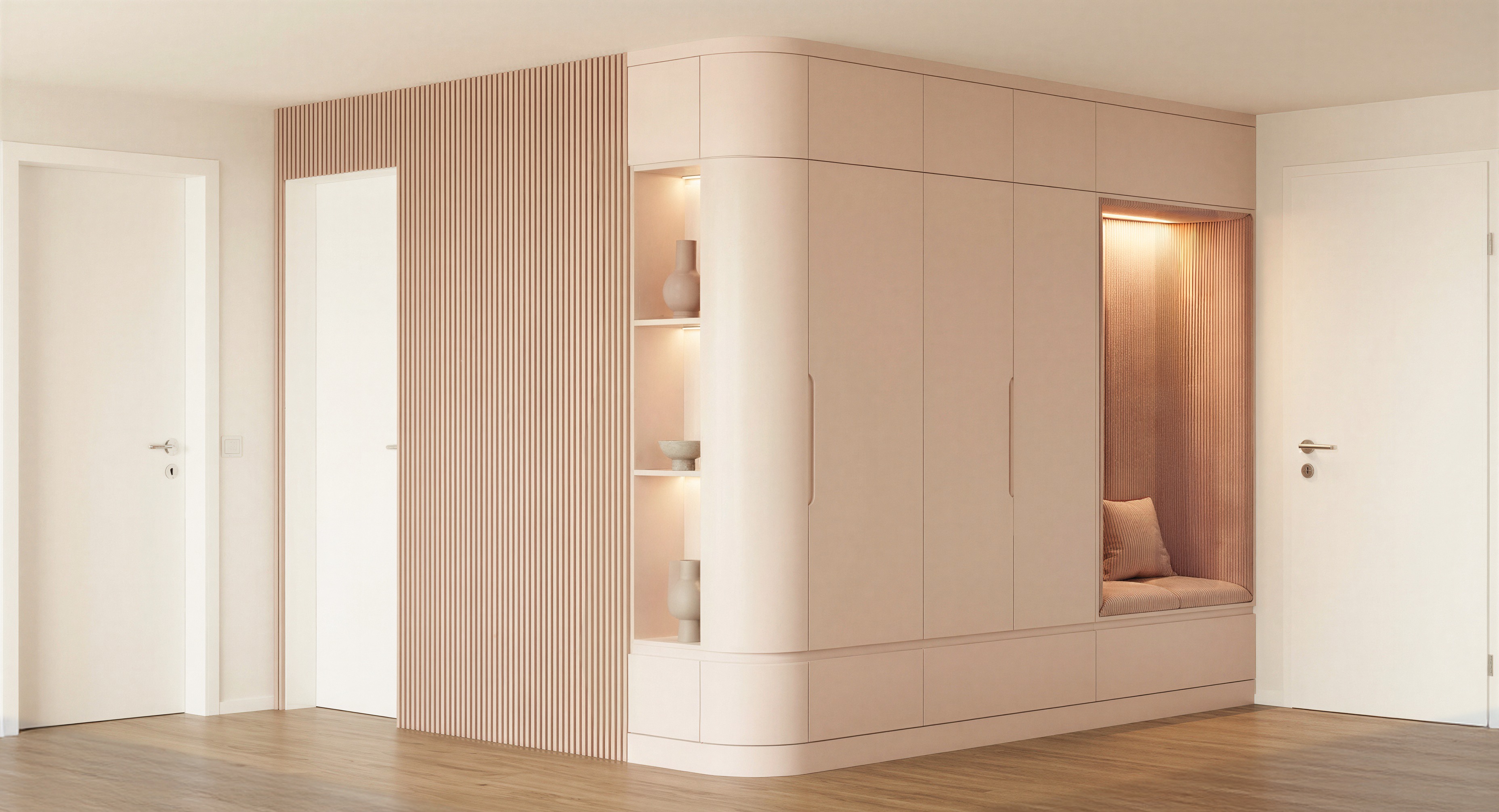 replace the linear vertical slats on the entire left wall panel with a continuous smooth deep set wavy sinusoidal 3d profile strictly mirroring the undulating wave geometry seen in image 4 png the texture must be a seamless warm soft dusty pink painted wood finish blending perfectly with the existing cabinetry and wall color the depth of the waves should be prominent catching soft shadows from the ambient light keep boundaries sharp