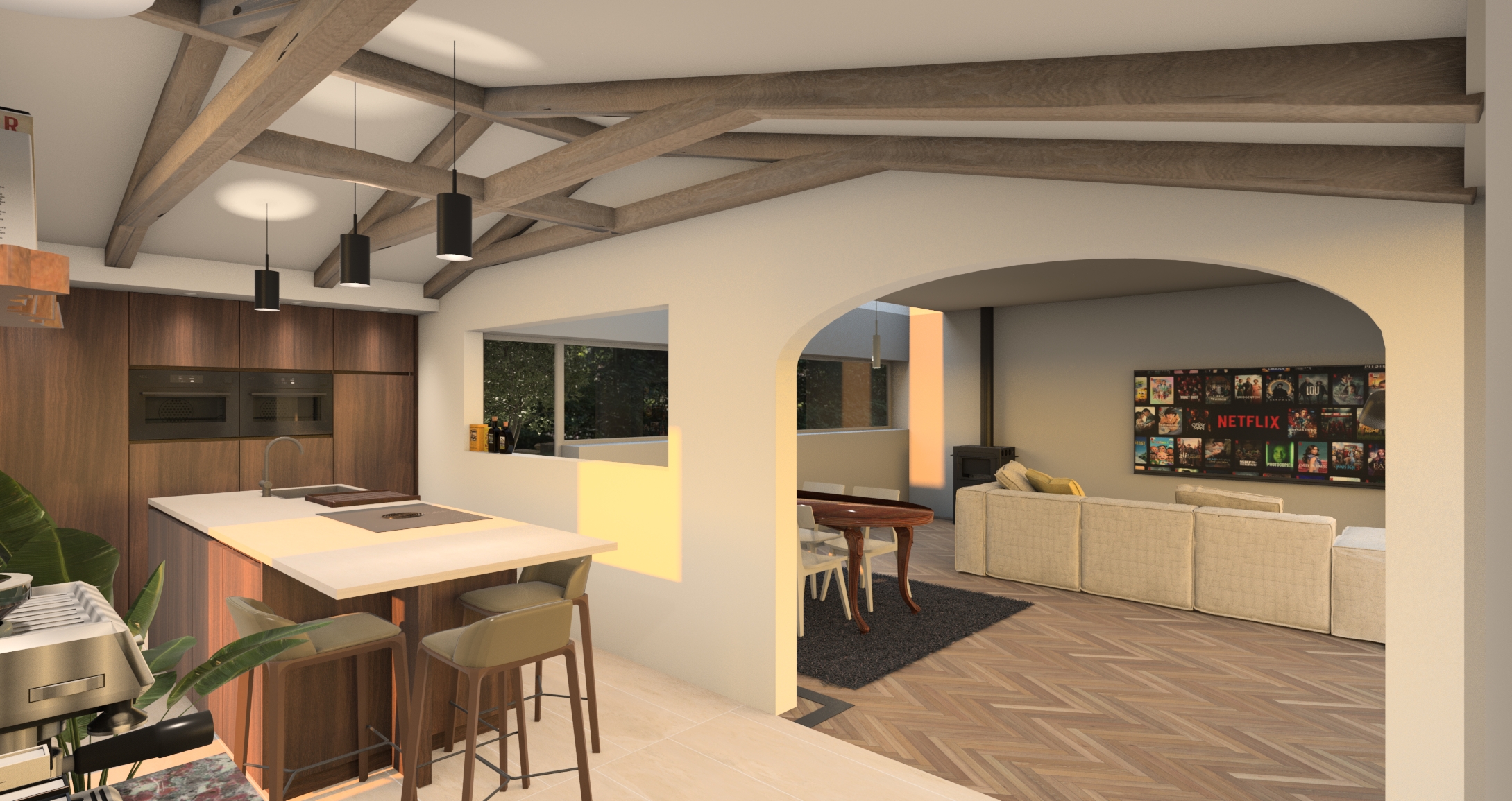 a modern kitchen interior with a cozy atmosphere highlight the warm lighting with soft shadows use rich walnut brown for the cabinets and a cream beige color for the countertops the walls should be a light warm ivory incorporate natural wood beams on the ceiling in a soft weathered gray paint the light fixtures matte black include a lush green indoor plant in a light gray pot feature a small coffee machine in sleek stainless steel on a textural green cabinet with gold knobs add a few books and modern decor items on a rustic wood shelf show a large window with a view of a verdant green garden outside for a fresh inviting ambiance