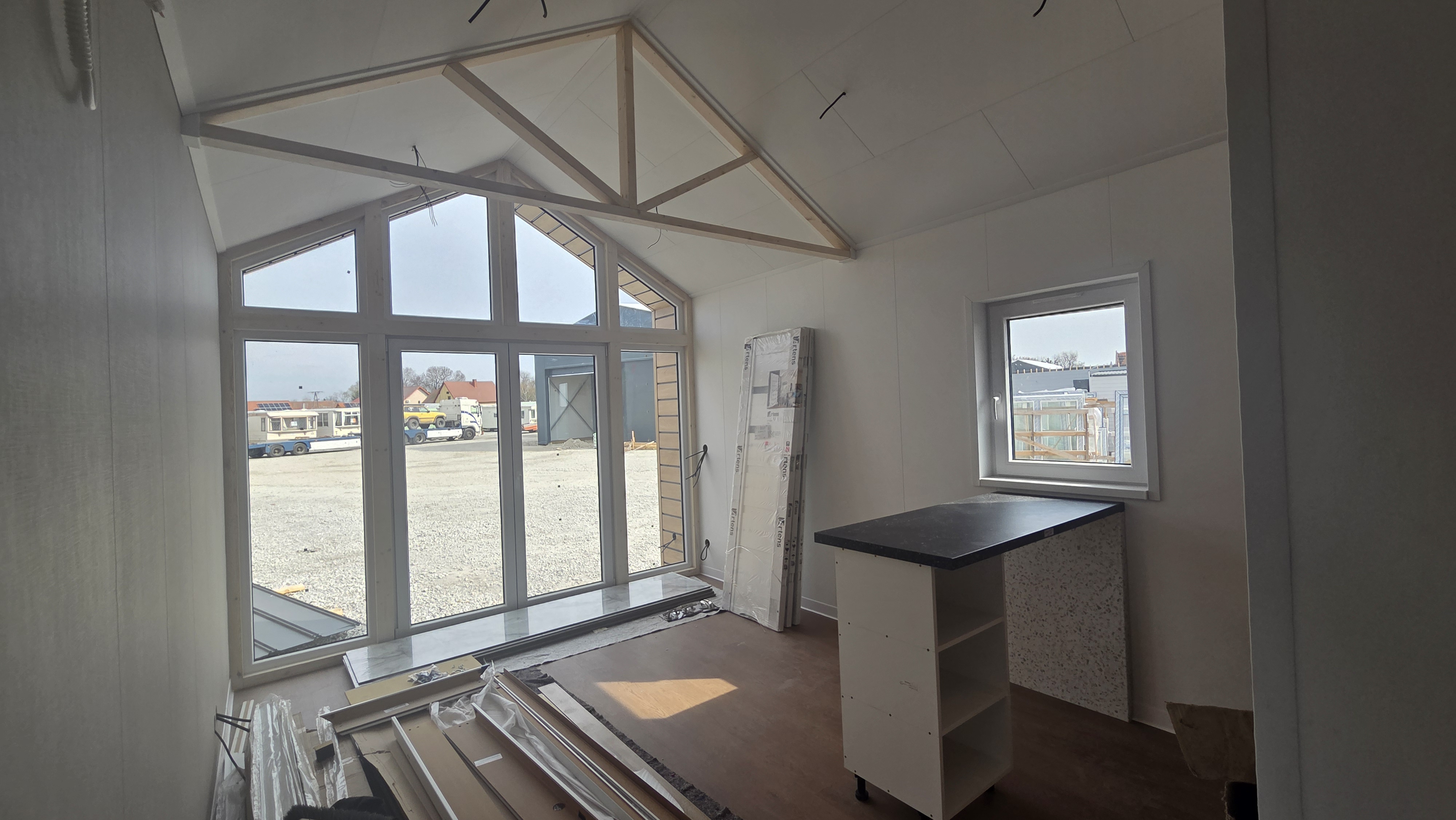 prompt modern cozy interior of a modular home living room with high ceiling and visible wooden beams large panoramic glazing on the left side outside the window there is a beautiful lake with calm water and behind the lake mountains and a dense forest clear air and soft natural daylight on the right side of the living room near the window place a small comfortable sofa in the corner minimalistic and elegant next to it a tall floor lamp with warm light on the left wall create a clean tv zone a flat screen tv mounted on the wall with a simple modern low cabinet underneath keeping the space minimal and uncluttered in the center keep a strong feeling of openness and spaciousness no unnecessary furniture airy layout wide walking space kitchen island finished with modern materials light wood stone or terrazzo style with subtle decorations like a bowl of fresh fruits and small aesthetic accessories overall style warm premium cozy scandinavian modern with natural materials soft sunlight coming from above midday clean and high quality render perfect for marketing realistic proportions bright and inviting atmosphere