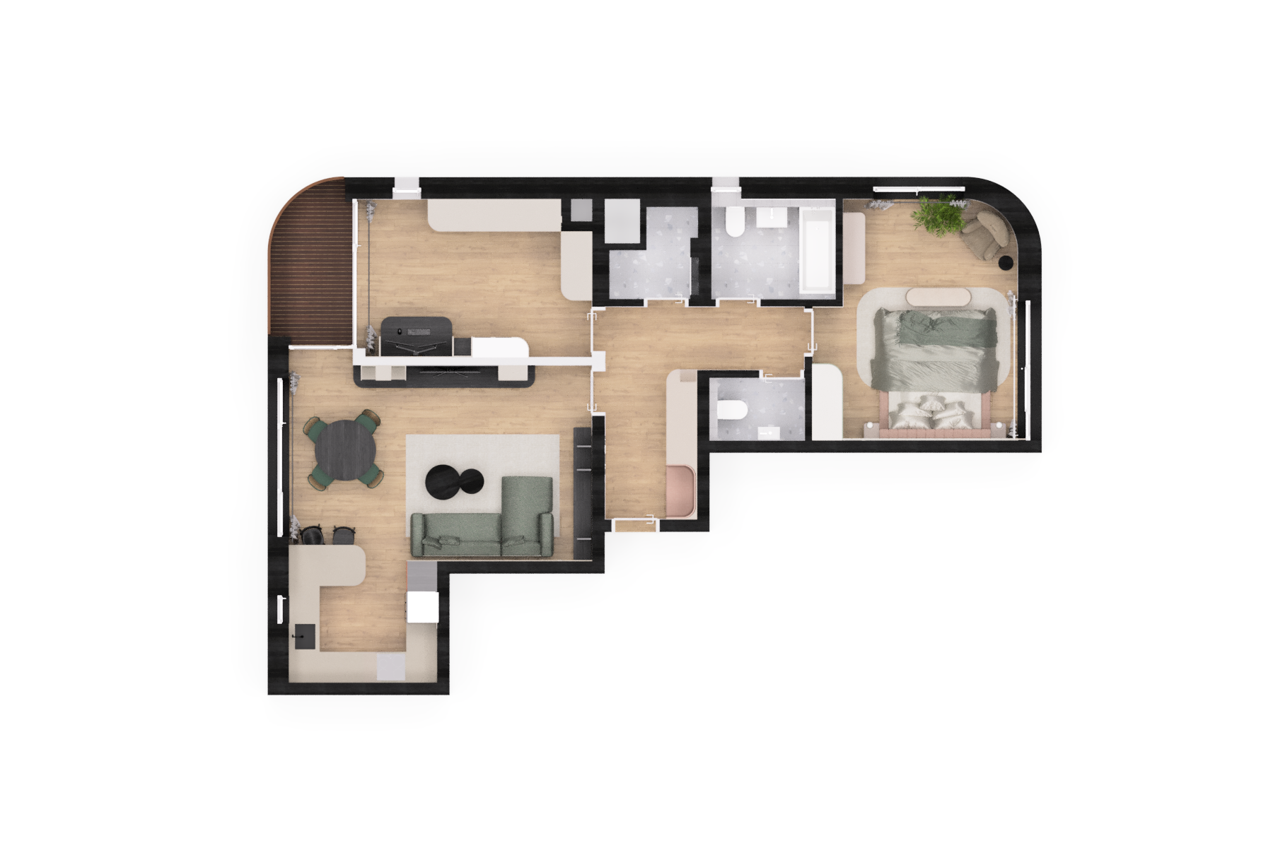 a high resolution photorealistic elevated isometric view of the exact architectural 3d floor plan layout from image 0 png including all internal furniture materials wood floors textiles kitchen cabinets and specific color palettes and tiny details the entire detailed model is perfectly isolated against a clean seamless solid white void background with no other environment the scene is illuminated by dramatic direct warm sunlight streaming from an off camera window matching the angle implied in image 0 png this light creates sharp distinct hard edged sunlight patches and shadows cast by the walls furniture and structure directly onto the flat white background surface surrounding the model the interior spaces retain their rich textures and depth but are sharply defined by the interplay of light and shadow on the exterior white void emphasizing the form and separation from the environment tiny dust motes are visible within the sunbeams the focus is sharp on the model