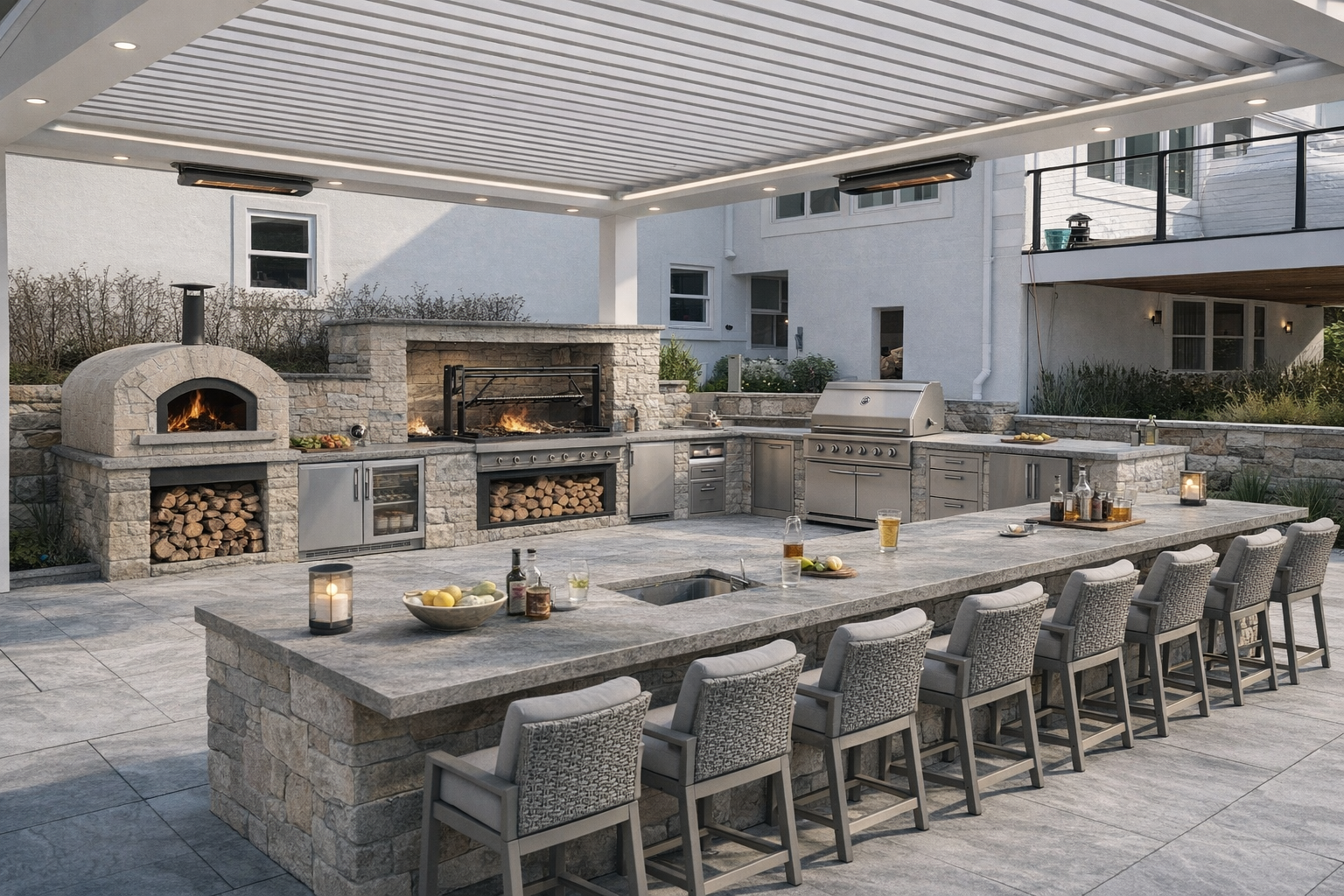 render a luxurious outdoor kitchen and bar area with a sophisticated atmosphere design features a modern patio with natural stone materials in creamy beige and light gray tones include a wood fired pizza oven with a warm glowing fire next to a stainless steel grill and neatly stacked firewood the countertops and seating are sleek and contemporary in soft gray hues enhance the ambient lighting with warm white recessed spotlights in a slatted pergola overhead present a setting of quiet elegance with the subtle greenery of surrounding shrubs and bushes set against a white contemporary house add small details like bowls of fresh fruits candles and a selection of spirits the overall atmosphere is serene and inviting perfect for a chic outdoor gathering