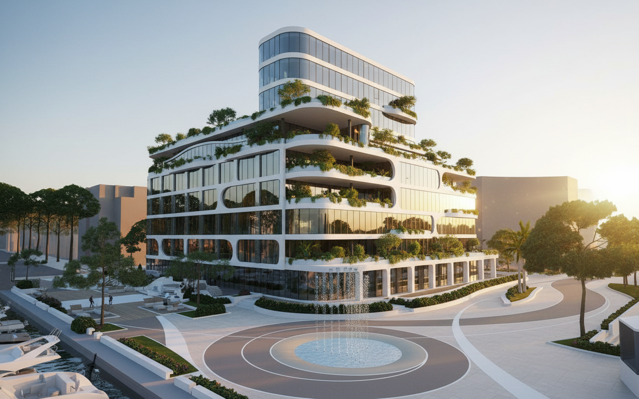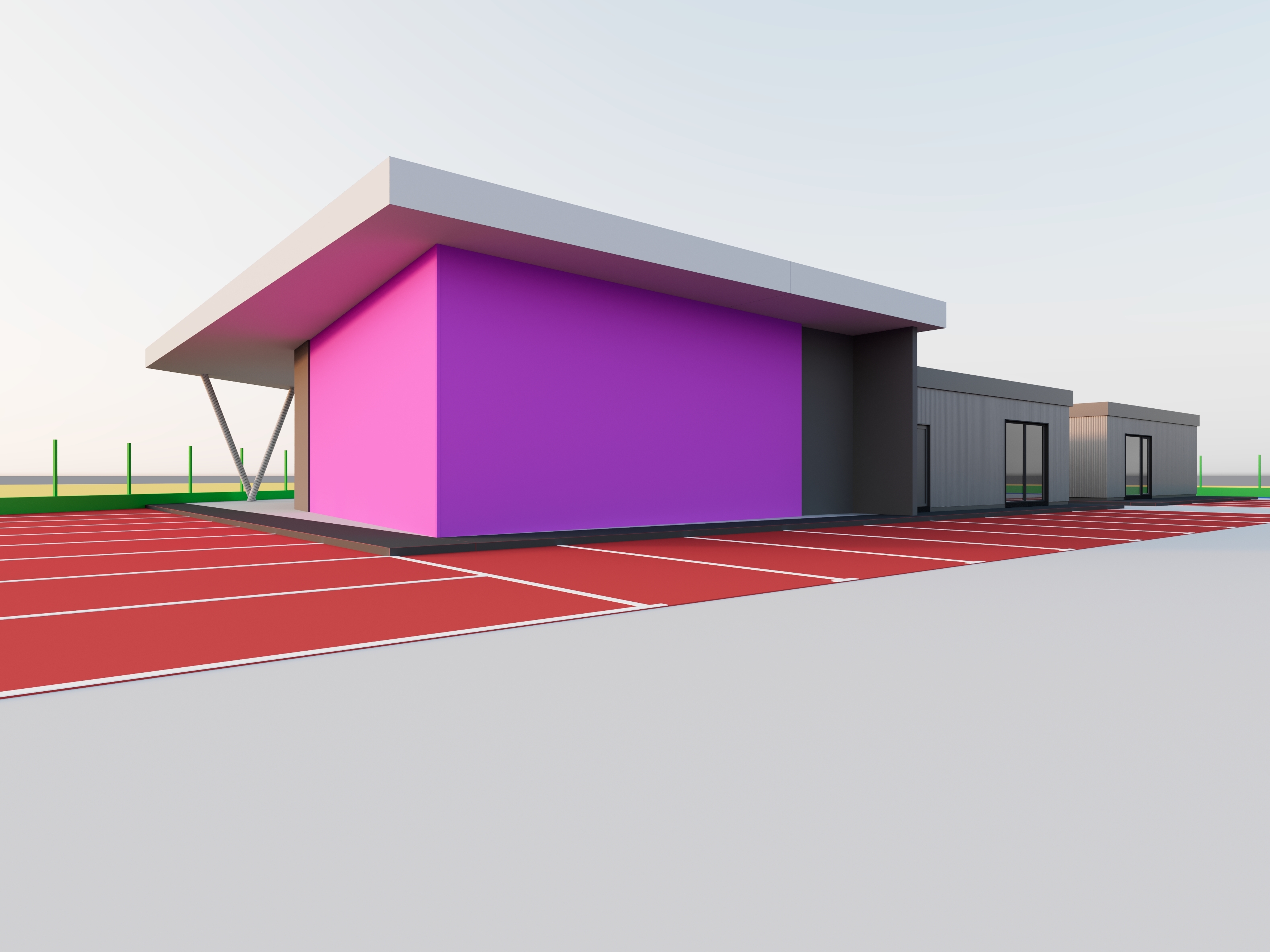 landscape the area behind the building do not alter the architecture windows or openings keep the architectural design exactly as it is we re replacing the colors with different materials the red should become the paving for the vip parking area the pink becomes a suspended glass display case and cars porsches are visible inside use a modern aesthetic for reference without any creativity just a change in materials the green details should become a light openwork fence
