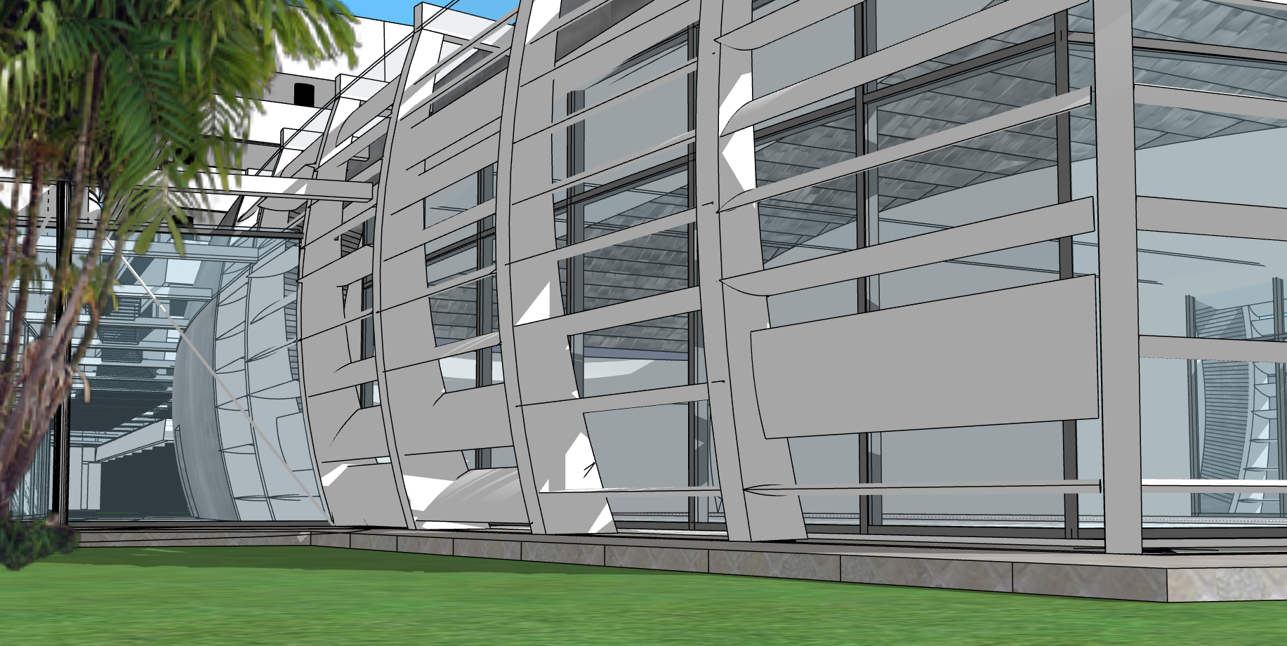 modern exterior shot exterior shot round gallery building soft warm sunlight in steel glass lamel facade architecture details visible from inside architecture