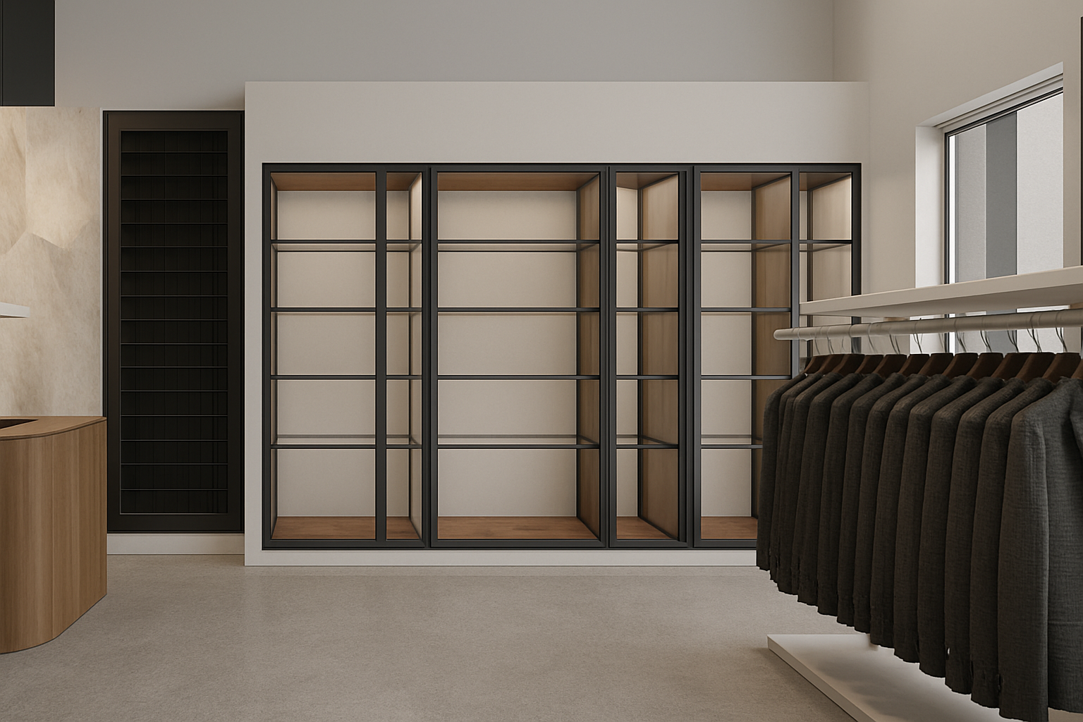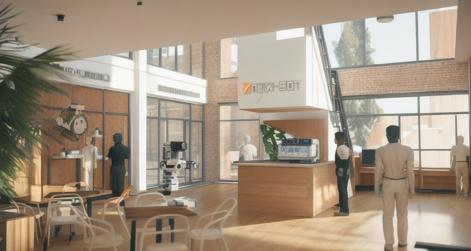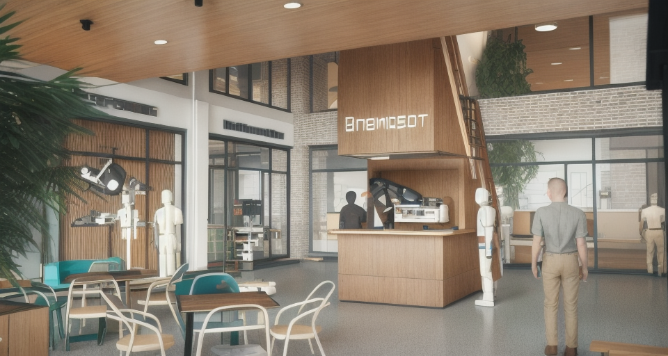 modernist interior shot modern coworking makerspace light colors people working robots wooden accents warm morning light ambience architecture