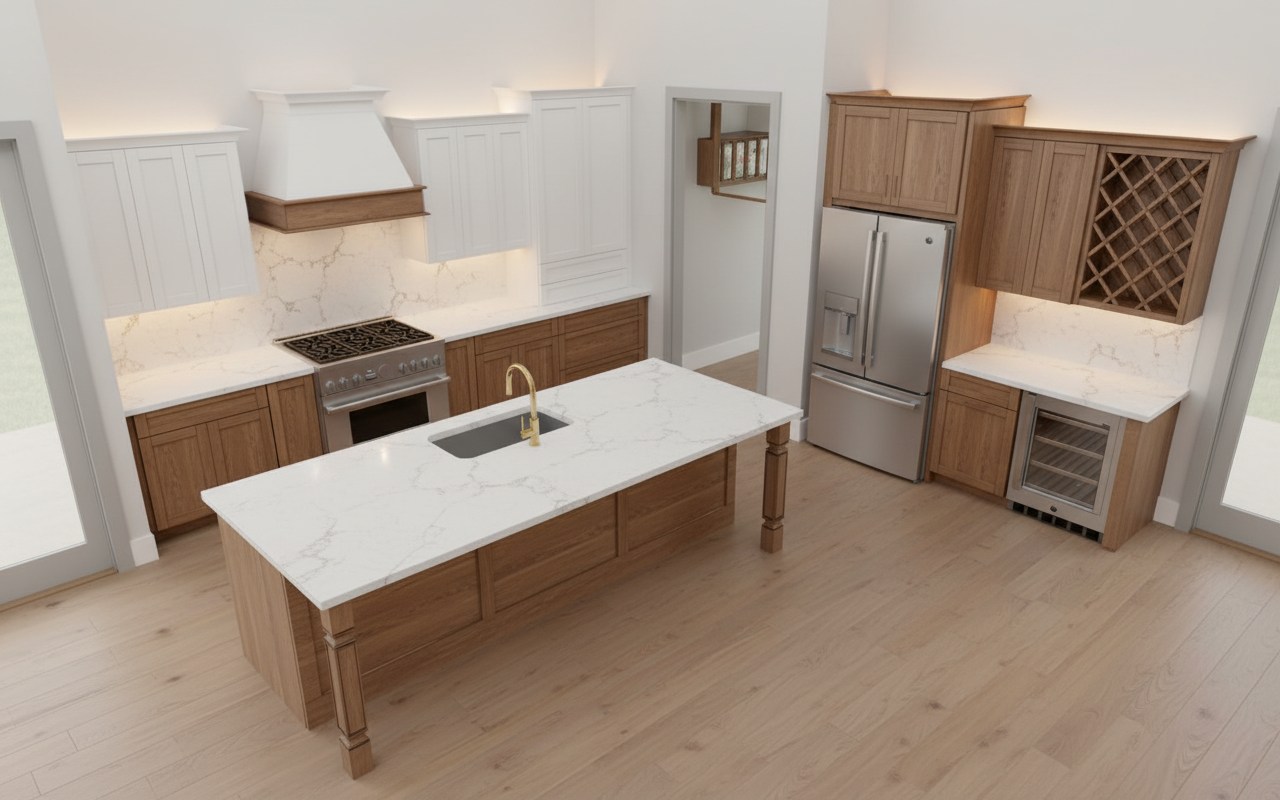 upper cabinets are white lower cabinets are stained wood medium brown countertop is a white quartz with light brown and gold veining the veins are small but frequent the sink faucet is gold upper cabinets next to and above refrigerator are the light brown stain as well the long upper cabinet in the middle of the image is light brown stain as well the floors are a light stained wood the walls are white the door trim and doors are light grey the doors are solid do not have glass the bottom band of the range hood is also the stained color the sink basin is a matte graphite color there is under cabinet lighting there are uplights above the cabinets the cabinets have gold hardware