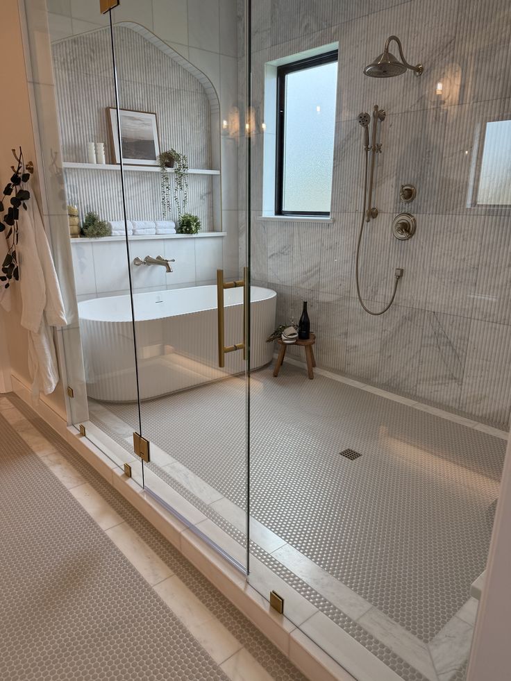 exterior shot wet room in bathroom with natural elements including marble floors