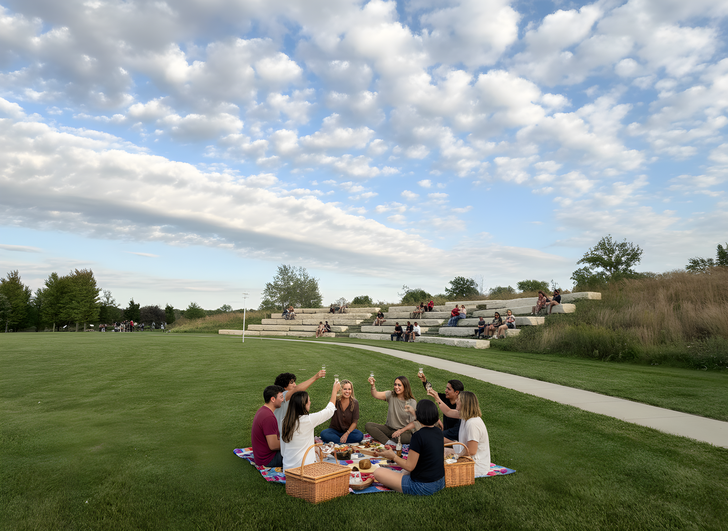 leave landscape as is show an outdoor movie event going on with a screen showing mamma mia make an evening scene with stars in the sky