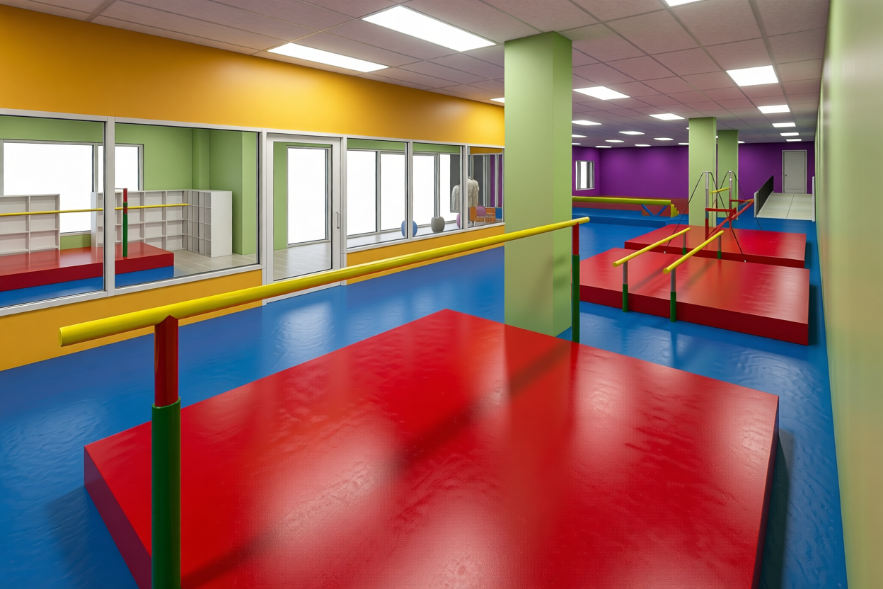 create of a photorealistic render of this space with a new mint and red colour scheme this is a professional environment with some drinks display do not include people make the view out the first floor window fields make back wall a limewash effect type finish make the flooring basket weave wood pattern