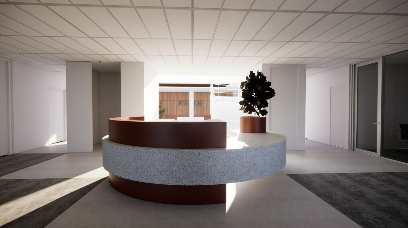 enhance this interior render to look more photorealistic and realistic while strictly maintaining the original proposed colour palette materials and textures do not modify the overall design intent layout or finishes improve overall image quality higher resolution sharper details refined shadows and accurate material shading add subtle warm artificial lighting to create a more inviting atmosphere lighting must remain balanced and realistic avoid harsh glare overexposure or overly reflective surfaces keep reflections soft and controlled this view does not include the reception area so do not add or modify reception joinery maintain consistency with the overall scheme where furniture is visible or required ensure any proposed added furniture selections match the existing approved colour scheme neutral tones with warm timber accents consistent upholstery tones and coordinated finishes do not introduce new colours outside of the approved palette in the opening on the left add a lift elevator integrated naturally into the design add troffer lights within the ceiling grid for consistent artificial illumination ensure all new elements remain subtle and realistic and do not distract from the intended interior design
