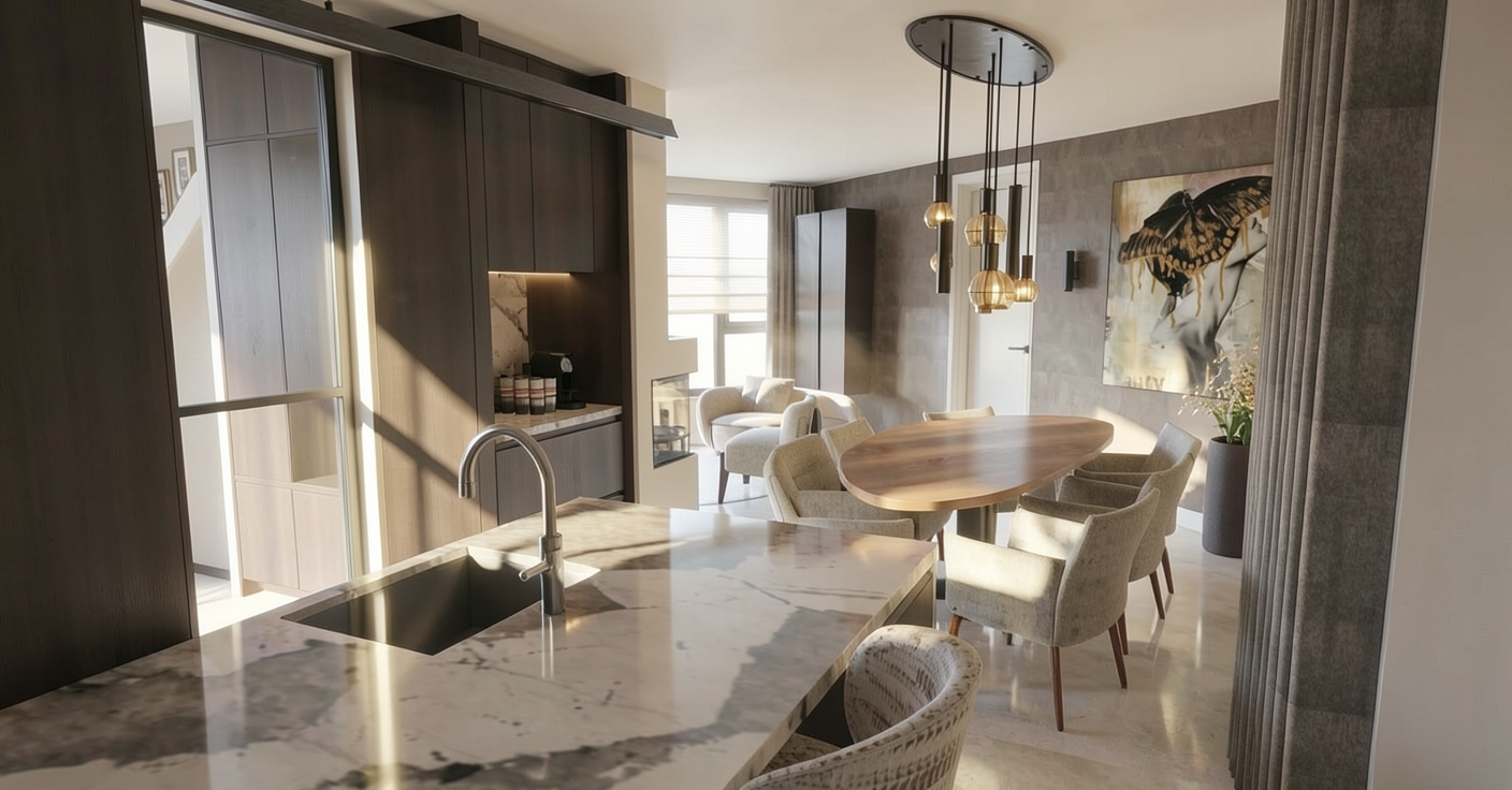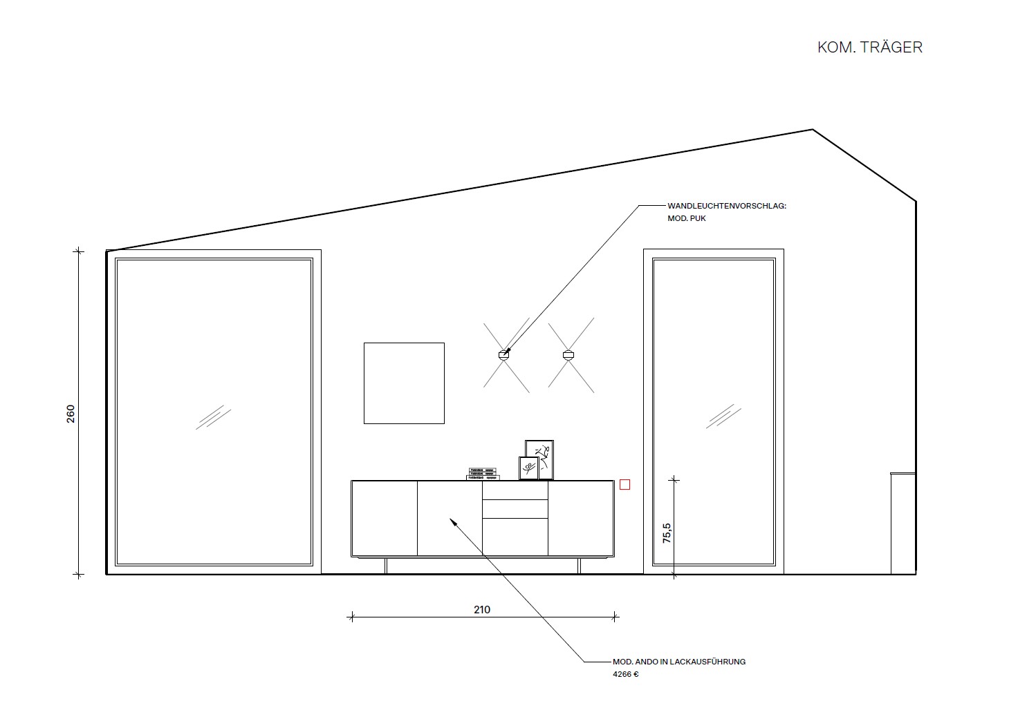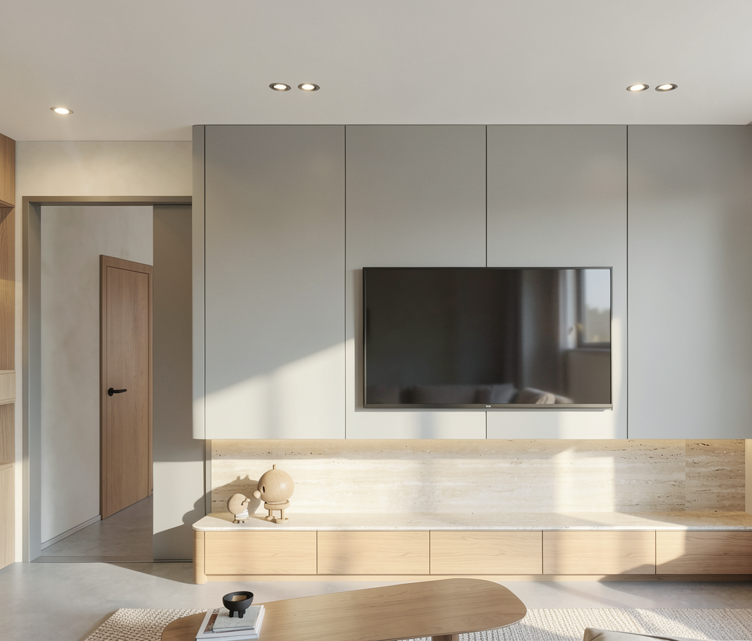 greige cabinets between big windows wall light puk from top light up and downlight