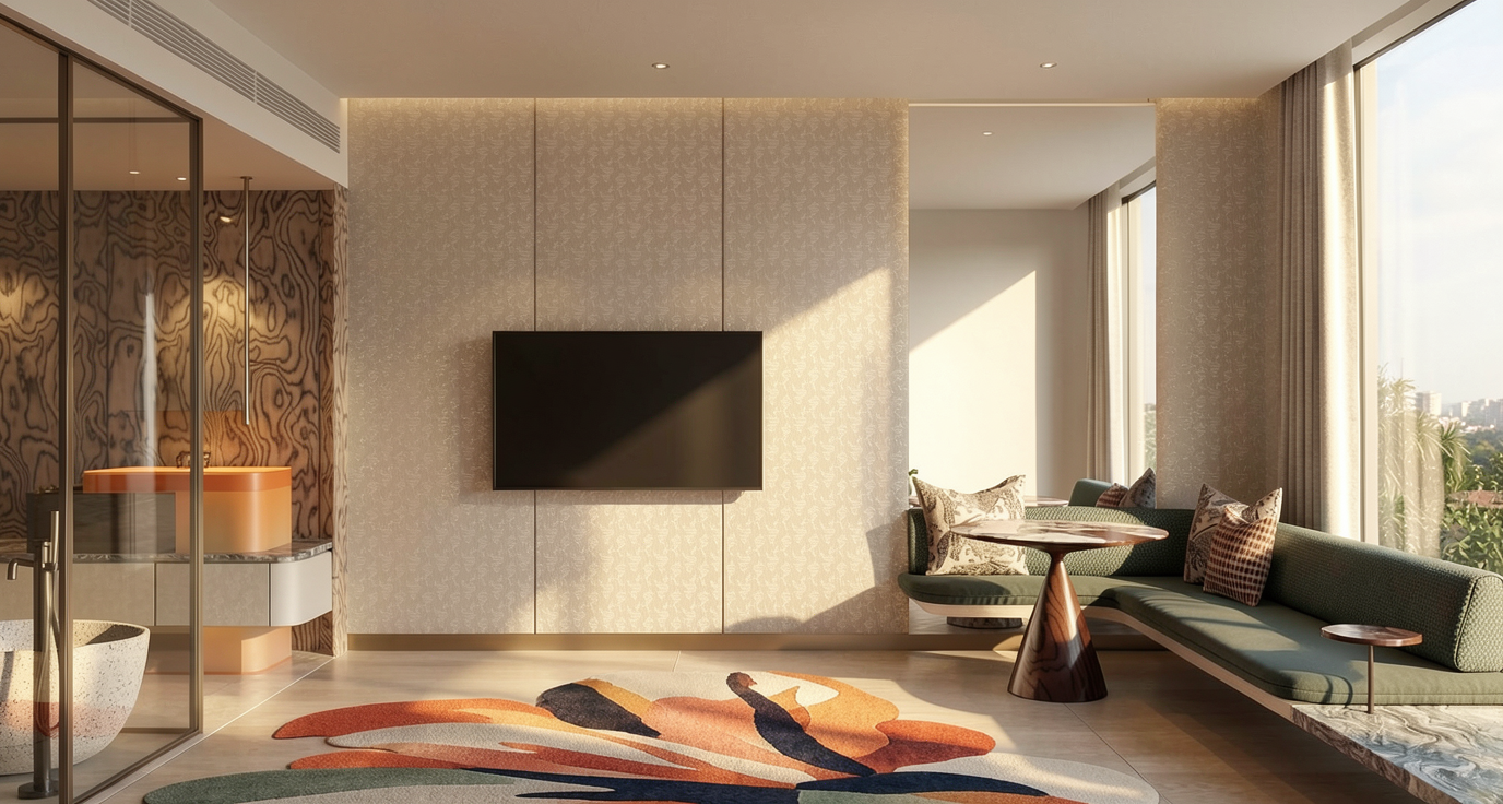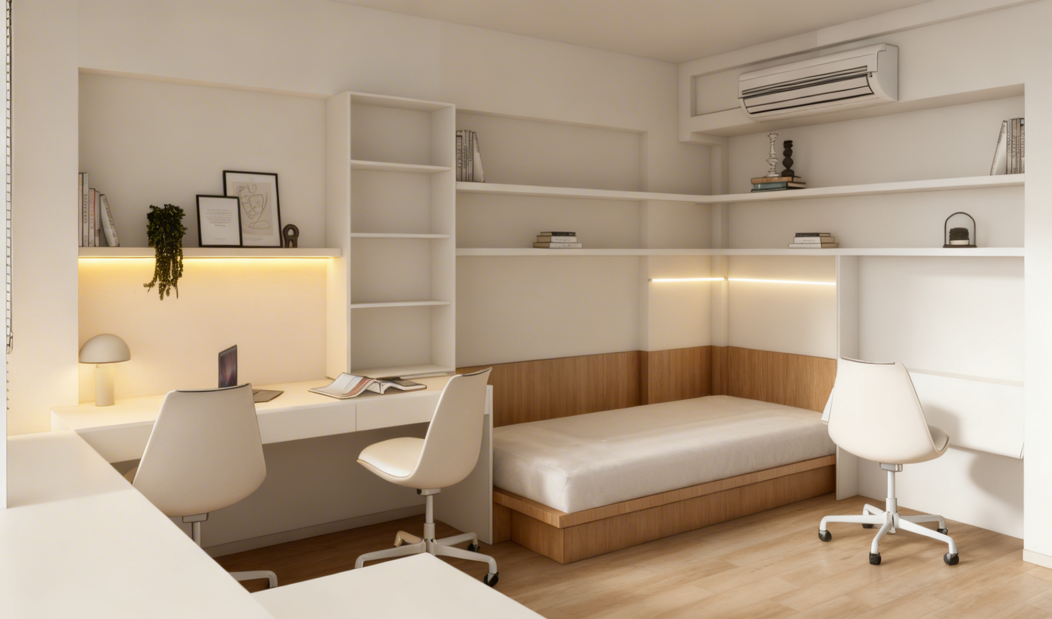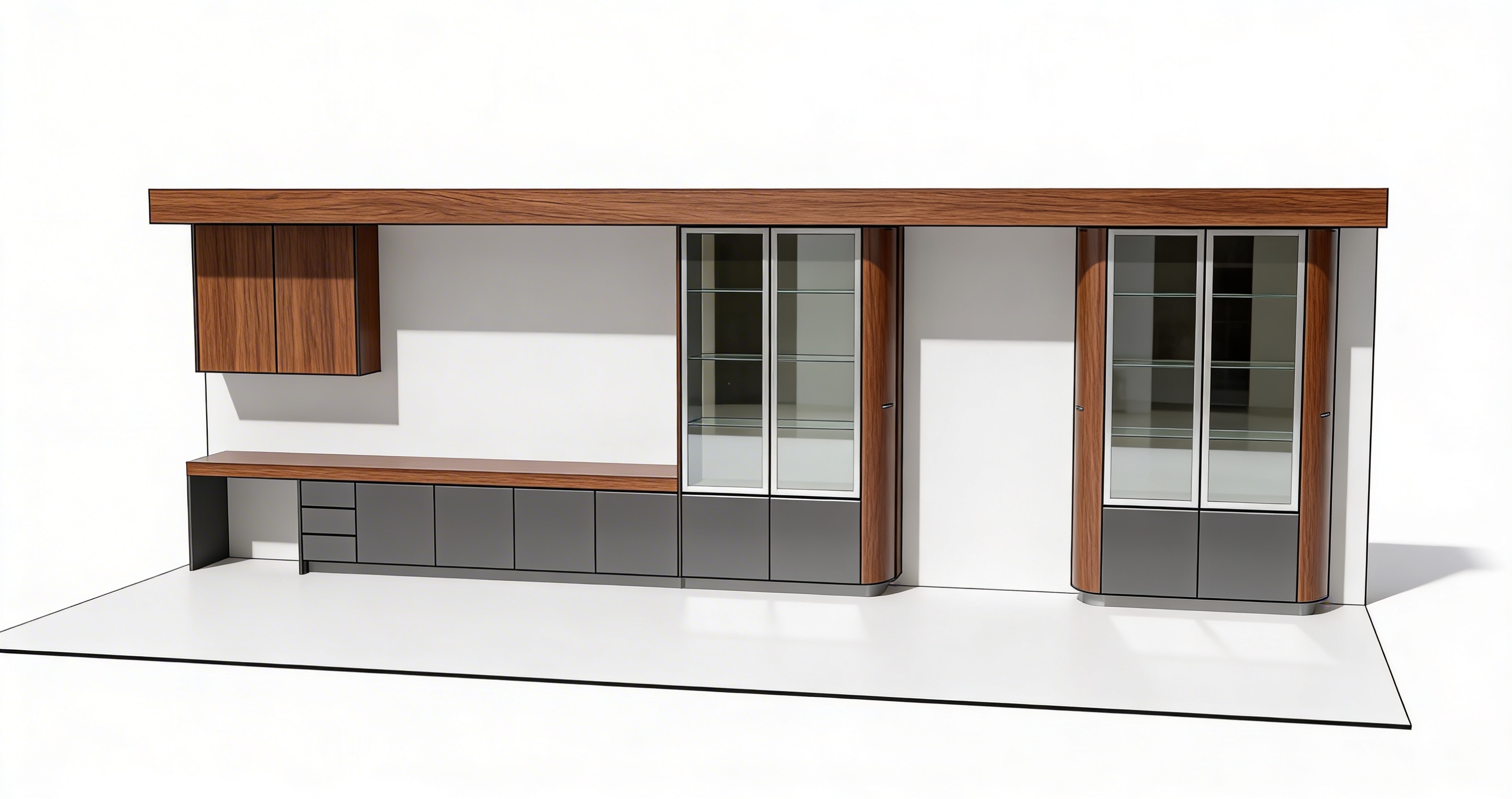 greige cabinets between big windows wall light puk from top light up and downlight