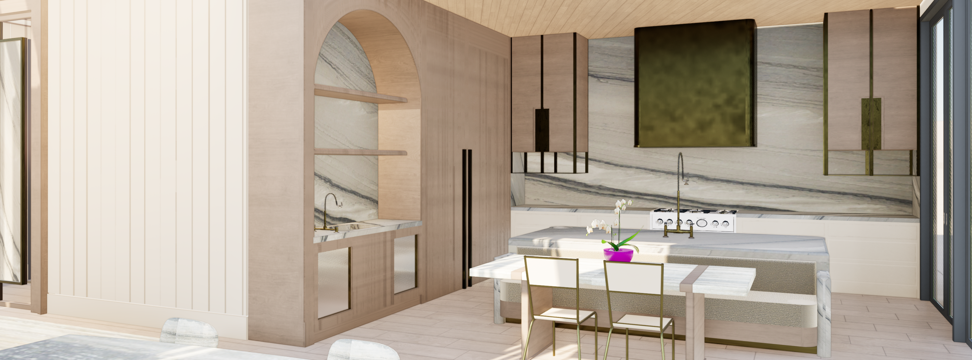 render a modern kitchen interior with a minimalist and elegant design the walls are a soft beige complemented by light wooden textures on the ceiling incorporate a large archway with a marble backsplash in shades of gray and white the island and countertops are matching marble with sleek integrated gold faucets add wooden cabinetry with brass handles and dark accents the dining area features a light wooden table with white chairs a vibrant purple flower arrangement sits on the table the atmosphere is bright and airy with natural light streaming in from large windows enhancing the serene and sophisticated ambiance