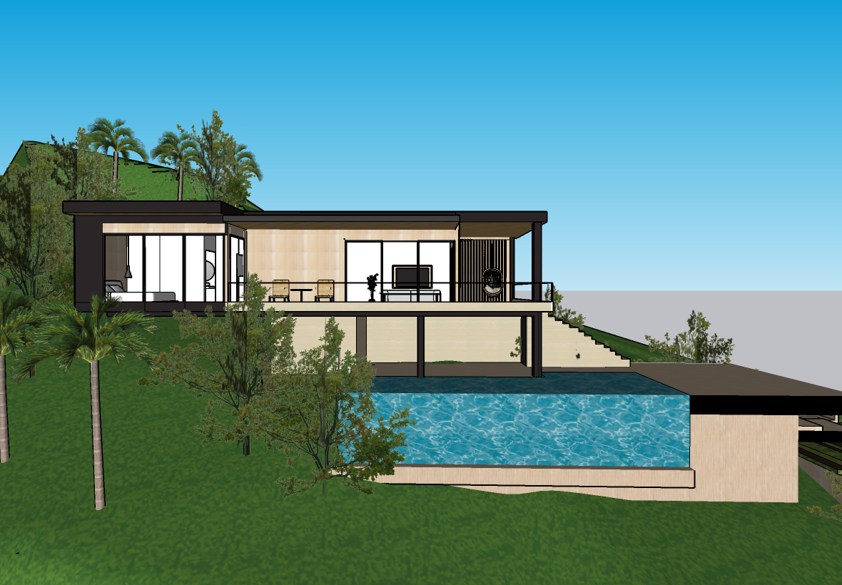 render a modern minimalist house on a hillside with a bright blue sky the house features wooden paneling in light beige and sleek black accents the large glass windows reflect the natural light creating a warm inviting atmosphere the staircase is a soft ivory color seamlessly integrating with the surrounding greenery add lush green grass and a variety of trees for a vibrant serene landscape with a hint of turquoise from a nearby water feature set the atmosphere to be peaceful and summer like with natural light enhancing the overall tranquility