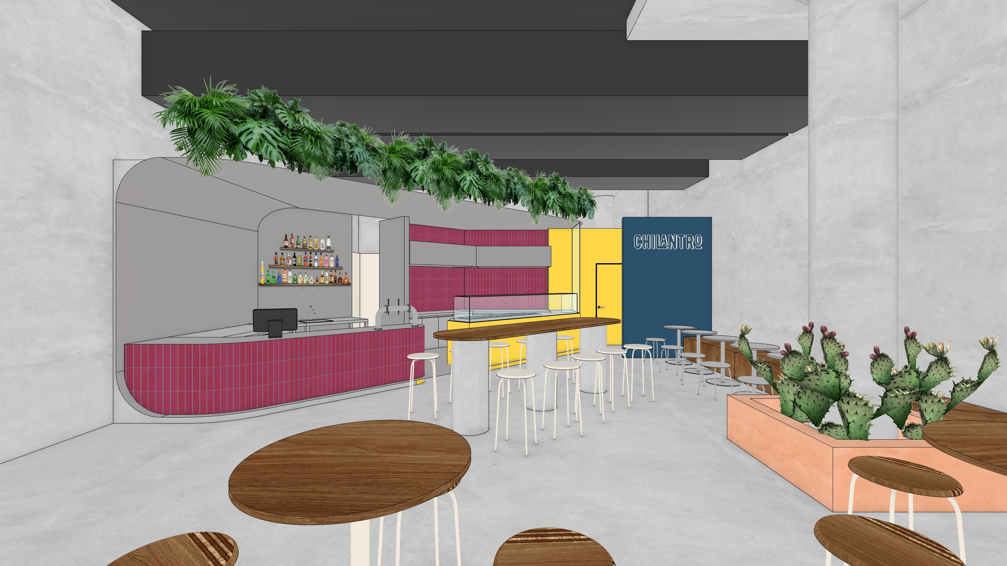 cozy contemporary urban mexican colorful bistro and bar keep original geometry add cactuses into terracota planter around the pillar grey surface surrounding counter is stainless steel replace lights add missing chairs by high tables landscape aspect ratio add mexican contemporary artwork on walls add pillows behind seating on the right side populate with people the magenta counter is made of small matte vertical ceramic tiles in the same colour add light bulb chains hvac under ceiling stays black as in second reference image