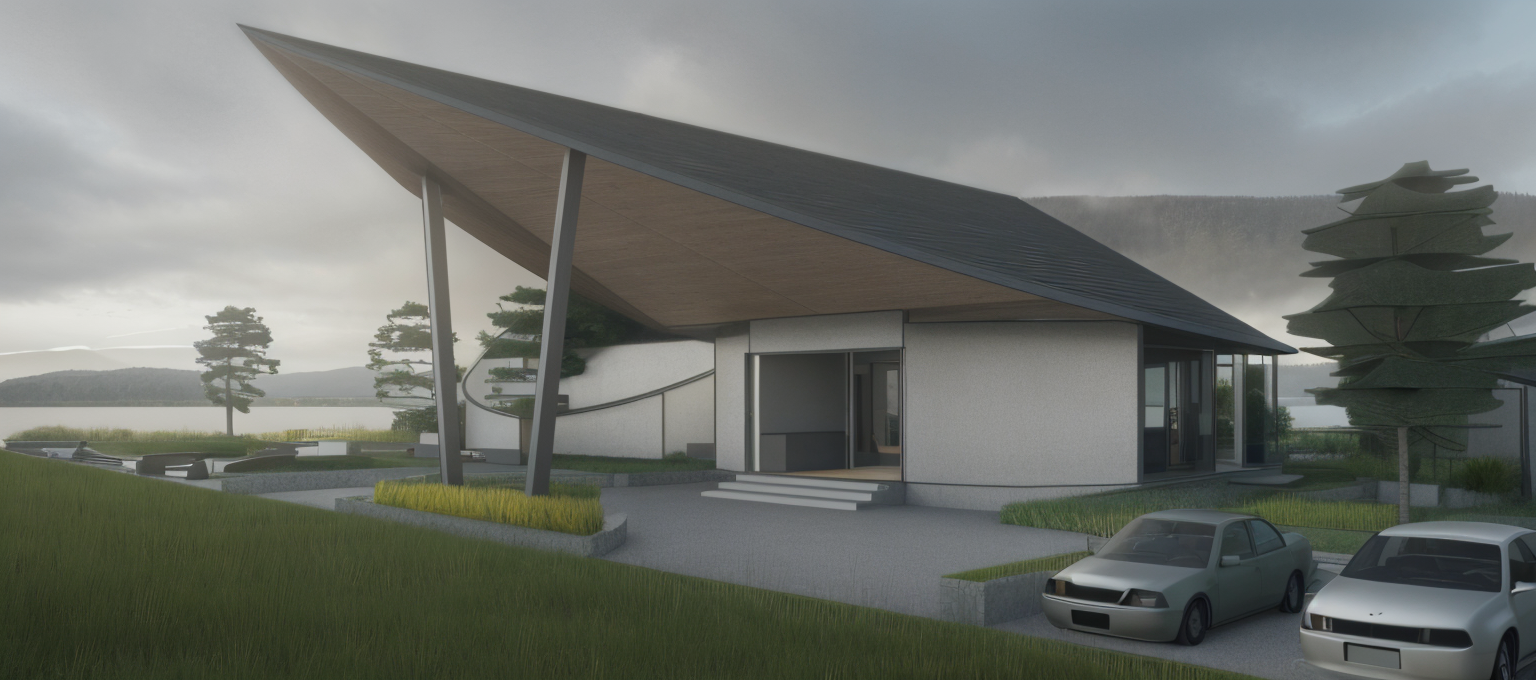 exterior shot realistic natural scene building in lake around with grass field roof shingle rood wood color add grass green color around roof light grey color realistic car brighter scene sunshine clear cloud building wood color architecture