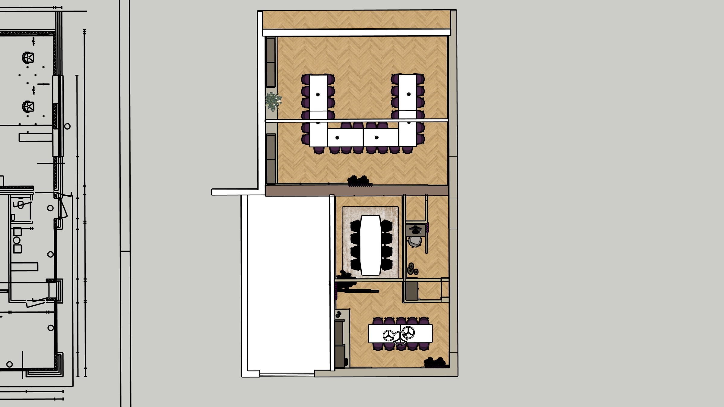 make a 3d top view with shadows of this picture don t change the materials or composition let the left under room closed