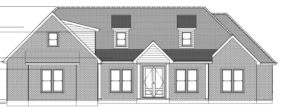 create a realistic rendering of a charming suburban house with a warm and inviting atmosphere the house features a sloped roof with deep charcoal shingles the brick exterior is a rich earthy red brown with subtle texture the white window frames and door trim provide a crisp contrast to the brick enhancing the classic appeal a small porch sits in the center with white siding above adding depth and character the windows are large with clear glass reflecting a bright sunny day surround the house with a lush green lawn dotted with colorful flower beds in shades of lavender and yellow the sky above is a clear blue with a few fluffy white clouds casting a soft light over the scene