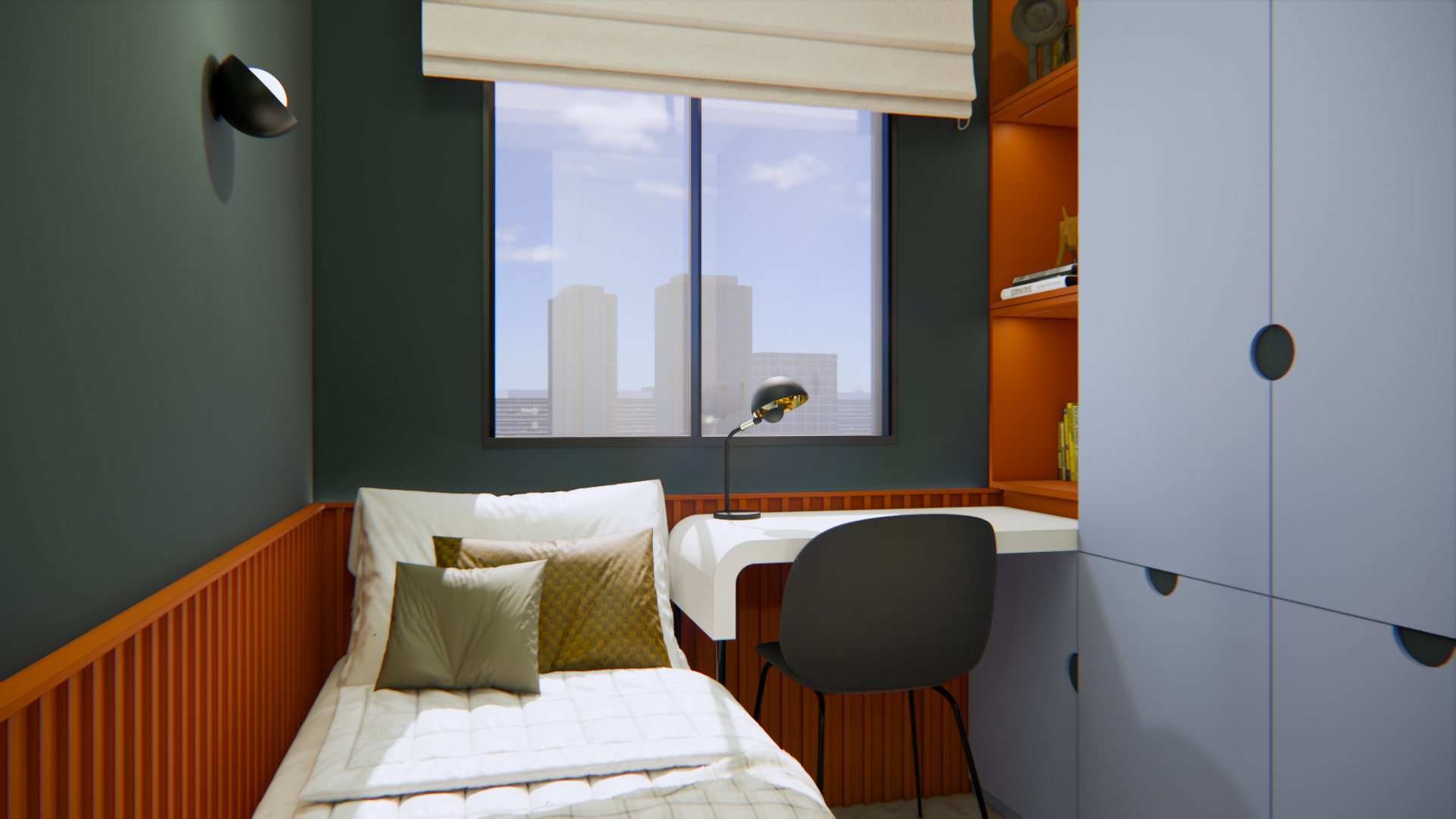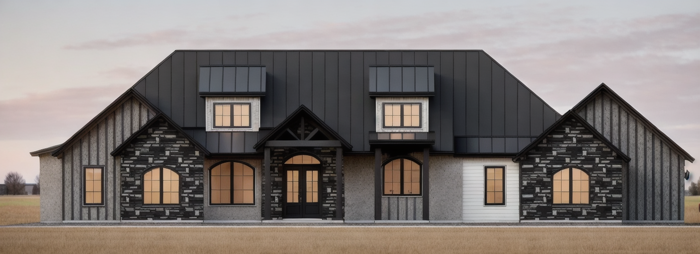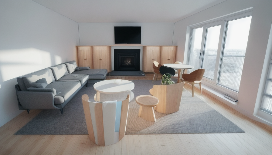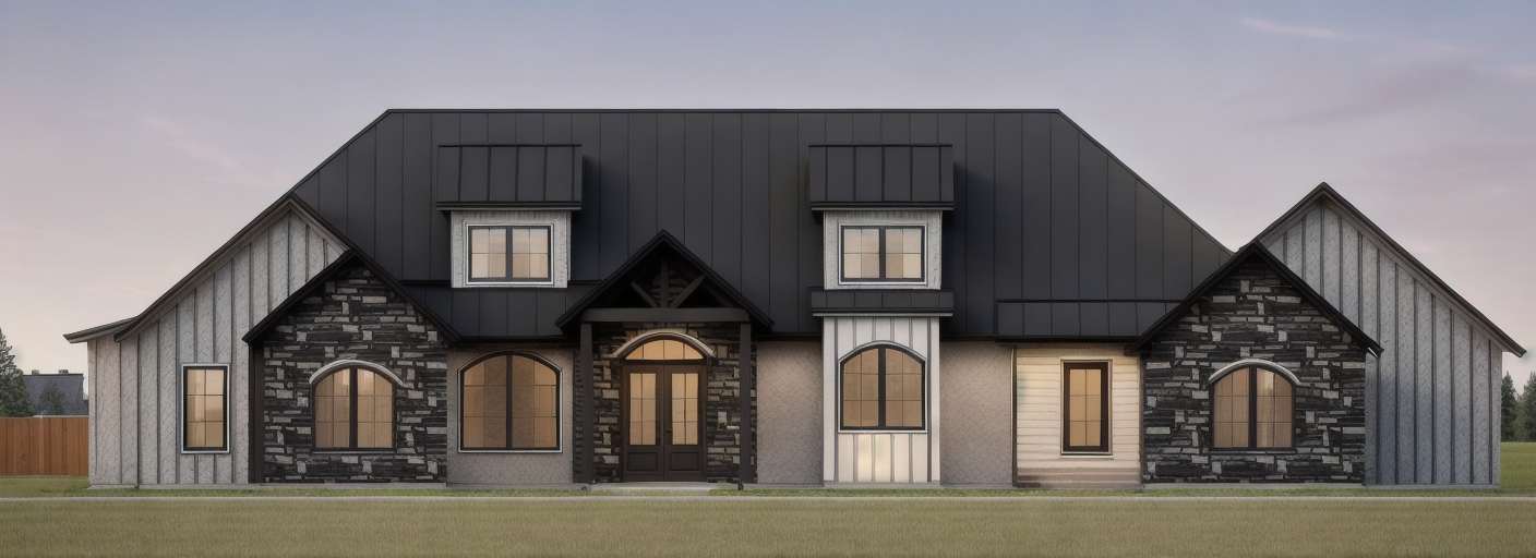 modernist exterior shot take a realistic photo place buildings in the background through the windows and a blue sky with few clouds the lighting is that of a summer day architecture