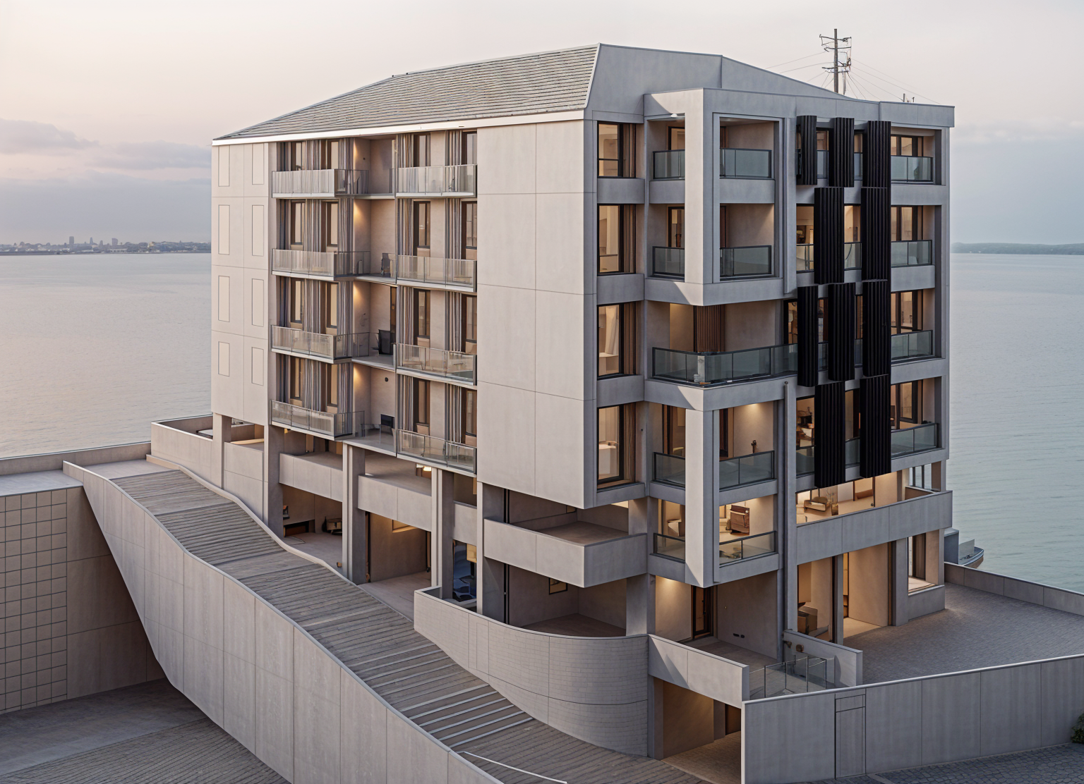 exterior shot recreate this elevation in the style of frank lloyd wright architecture