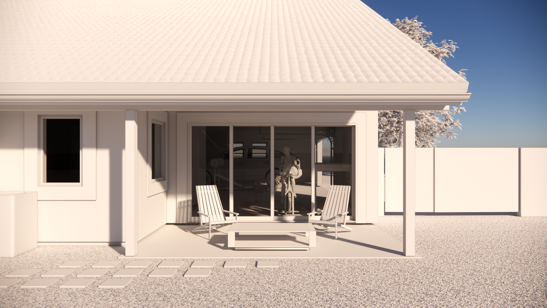 exterior shot render a serene patio scene featuring a house with a textured spanish style roof and beige walls the patio should include two white wooden chairs and a matching coffee table sitting on a clean light gray gravel path the scene is set under a bright clear blue sky casting soft shadows that add depth in the background a tree with delicate frost covered branches enhances the tranquil atmosphere this picturesque setting embodies a peaceful sunny morning vibe with natural light illuminating the space