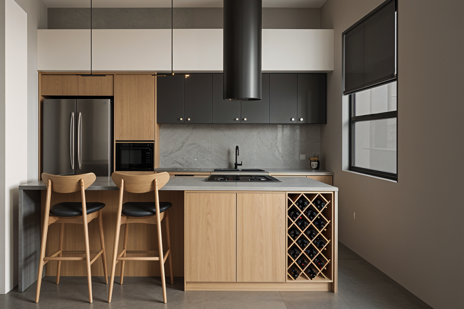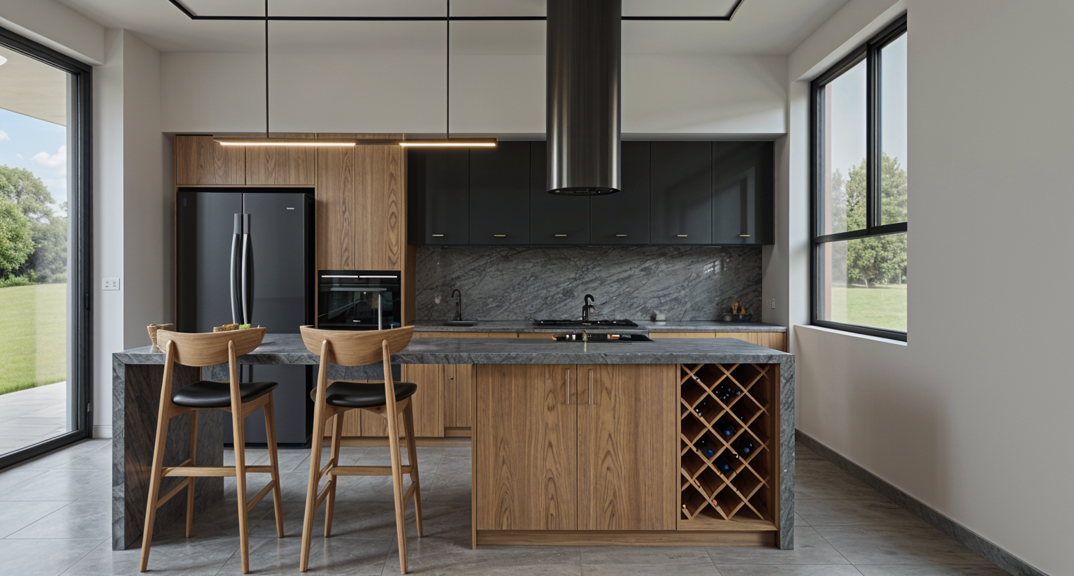 ultra realistic photorealistic render of the uploaded 3d kitchen model keep absolutely all geometry proportions furniture placement and windows exactly as in the 3d model do not change replace or reinterpret any part of the modeling windows located in the corner of the room render them as clear transparent glass with white wooden frames show a blurred green garden through the glass sunlight must enter through the windows creating natural warm light and realistic shadows inside materials use the exact materials from the 3d model matte beige cabinet fronts glossy handcrafted zellige tiles backsplash with slight irregularities light gray travertine countertop with subtle veining natural wood flooring with warm grain details lighting natural daylight enhanced with sunlight entering from the windows adding warmth and contrast combined with integrated ceiling spotlights with realistic led glow furniture respect the 3d model exactly slim dining table with bleached oak textured top light wood chairs with woven seats transparent glass vase with dried pampas matte red designer vase ultra hd render very detailed textures realistic materials natural depth of field elegant and contemporary atmosphere high end interior design magazine style walls smooth white plaster very clean finish backsplash white glossy handmade zellige tiles 10x10 cm with slight irregularities table natural light oak wood visible grain texture flooring light oak parquet wide planks 20 cm matte finish hood flat built in discreet integrated in the ceiling beam windows frames full height glass up to the ceiling no horizontal divisions small window above countertop dark oak frame atmosphere bright natural daylight entering through the large glass windows soft and warm with gentle shadows contrast refined balance between light and shaded areas realistic reflections style magazine style architectural photography ultra hd tactile materials elegant and contemporary