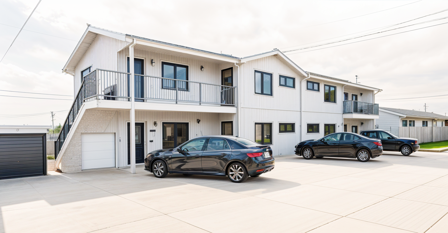 all elements the furniture d cor lighting and layout remain exactly as in the original image with nothing altered added or removed a modern multifunctional home office and lounge with a calm refined atmosphere the space is softly illuminated by natural daylight in a soft white tone creating a serene balanced mood light filters through sheer beige curtains draped over a large black framed window with slim aluminum mullions and clear matte glass panels allowing diffused daylight to fill the room with gentle brightness the floor is natural oak in a herringbone pattern with a matte finish that adds warmth and subtle texture the built in cabinetry and desk are finished in taupe beige hex cbbba0 a light taupe with a cool undertone smooth matte surface and no visible wood grain or texture the walls are painted in soft off white with a cool neutral undertone complementing the cabinetry and creating a cohesive tranquil palette to the right a sofa upholstered in deep olive green boucl fabric anchors the space soft textured and matte with a tactile surface that catches light subtly it s styled with a beige cotton throw and two cushions one in terracotta velvet the other in off white linen above the sofa hangs an abstract black and white artwork complemented by a matte black floor lamp with a white cylindrical shade the desk area features light neutral tones and an ivory upholstered swivel chair adding softness and balance books and a hanging green plant introduce natural accents without disturbing the clean geometry of the design the atmosphere is cool minimal and harmonious defined by natural oak flooring cool taupe cabinetry and soft white daylight enhancing the contrast of textures from matte wood to tactile boucl captured at eye level with a wide angle lens the rendering should preserve a gentle depth of field with the sofa and desk in focus and the background softly fading into light