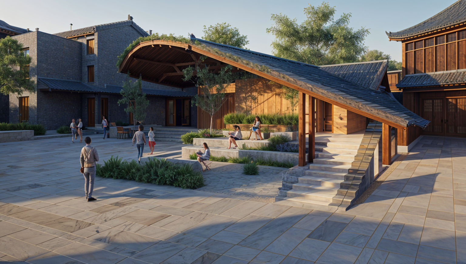 keep the benches the red brick simulate the color and texture of the building add the fountain in the middle change the river bed to look more realistic add shutters to the windows change the path to concrete