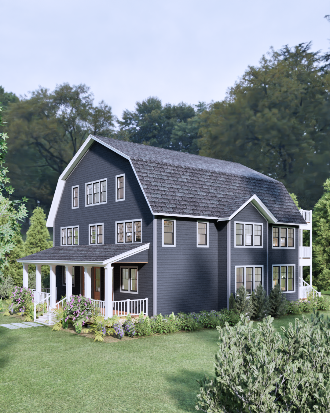 the house is surrounded by a lot of trees small bushes and flowers in the garden