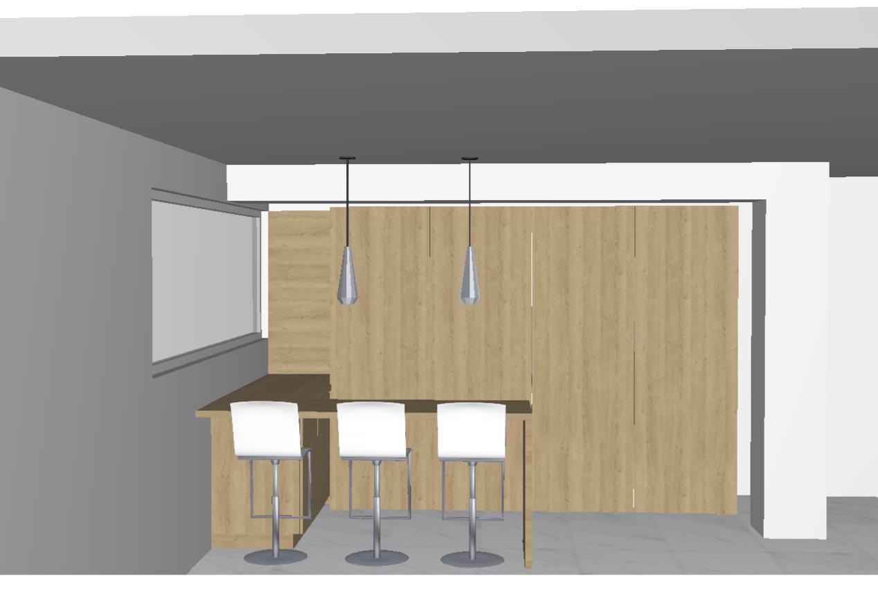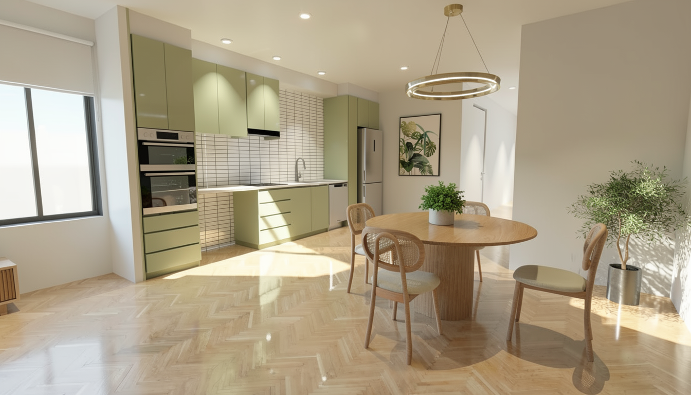 a modern kitchen interior featuring a minimalist design with a neutral color palette the floor is made of polished light marble with subtle gray and beige veining the cabinetry are crafted from light oak wood providing a warm contrast to the white countertops and barstools the walls are painted a soft dove gray complementing the sleek stainless steel fixtures soft diffused natural light streams through large windows creating a serene and inviting atmosphere