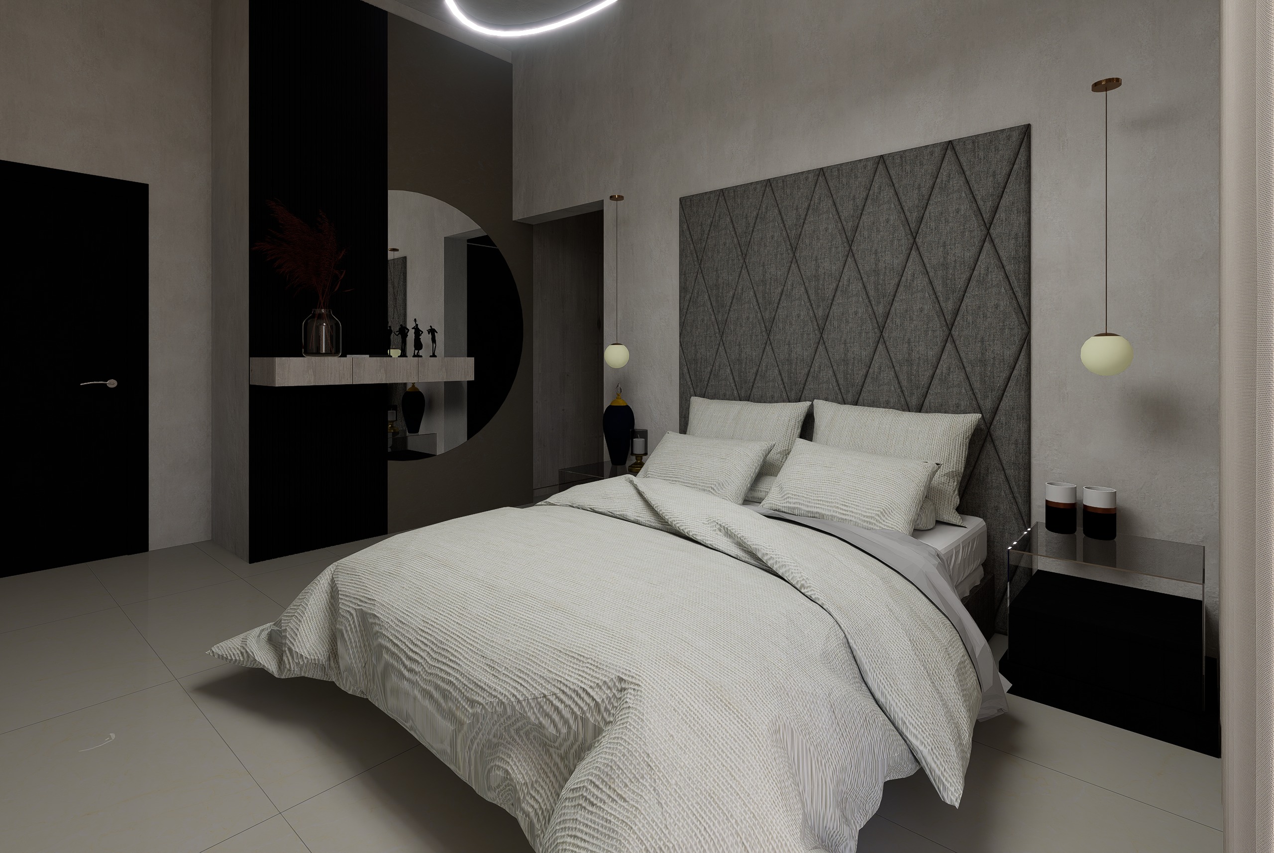 chnage bed headboard to very light grey color and dim yellow lighting with dim yellow bedside hanging lights