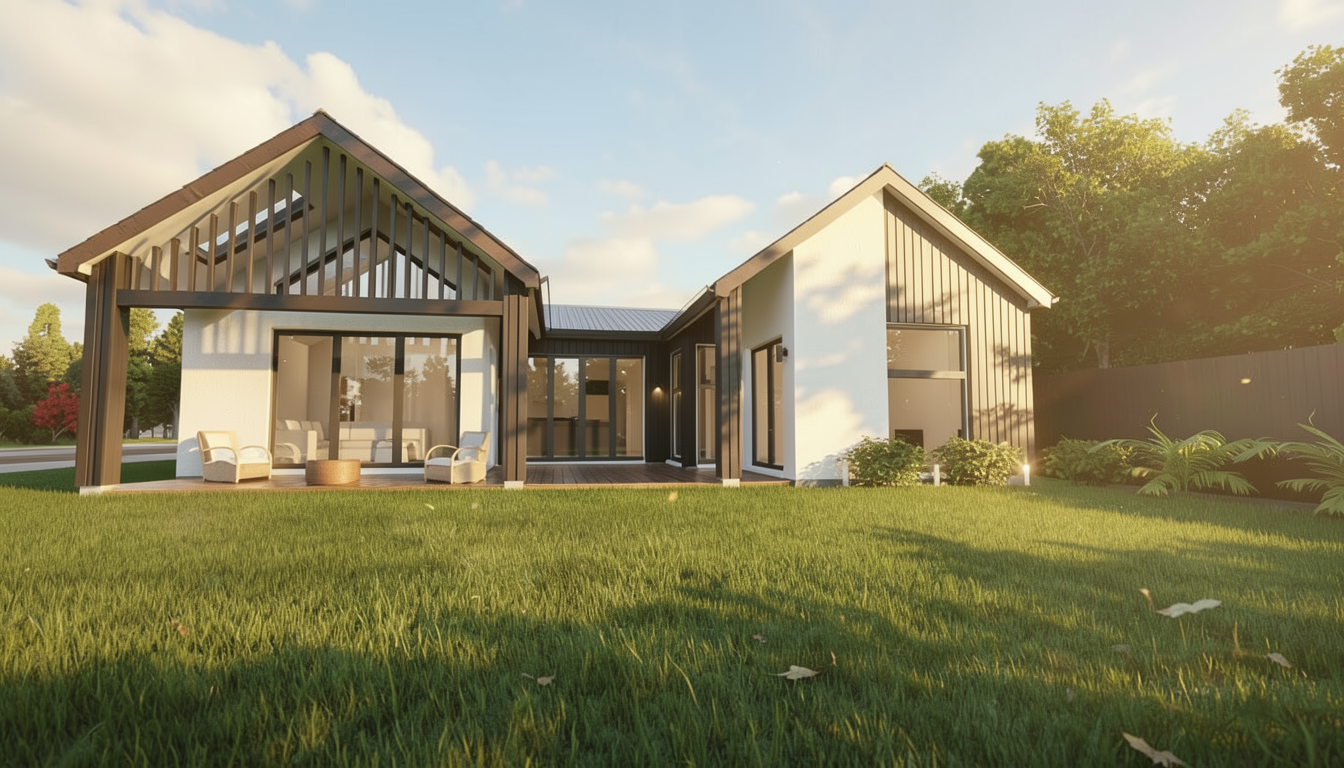 modern kitchen with a view of apartment rooftops from kitchen window only neutral painting behind dining table in background black hardware and faucet gloss white tubular rangehood honed marble counters light oak floors dusk lighting with pools of light from recessed lighting