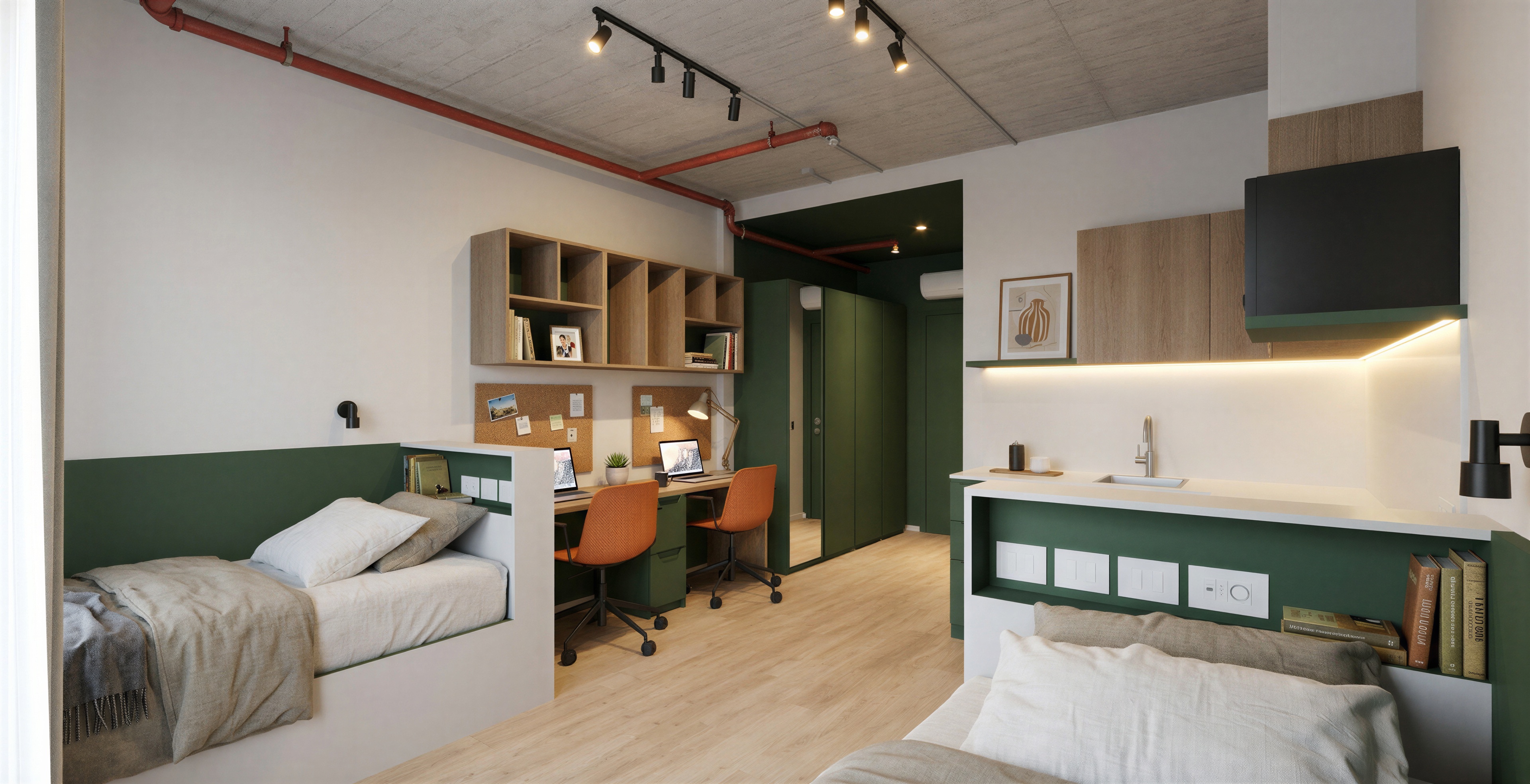 soffitto in cemento verniciato grigio chiaro scocca sedia in plastica arancio