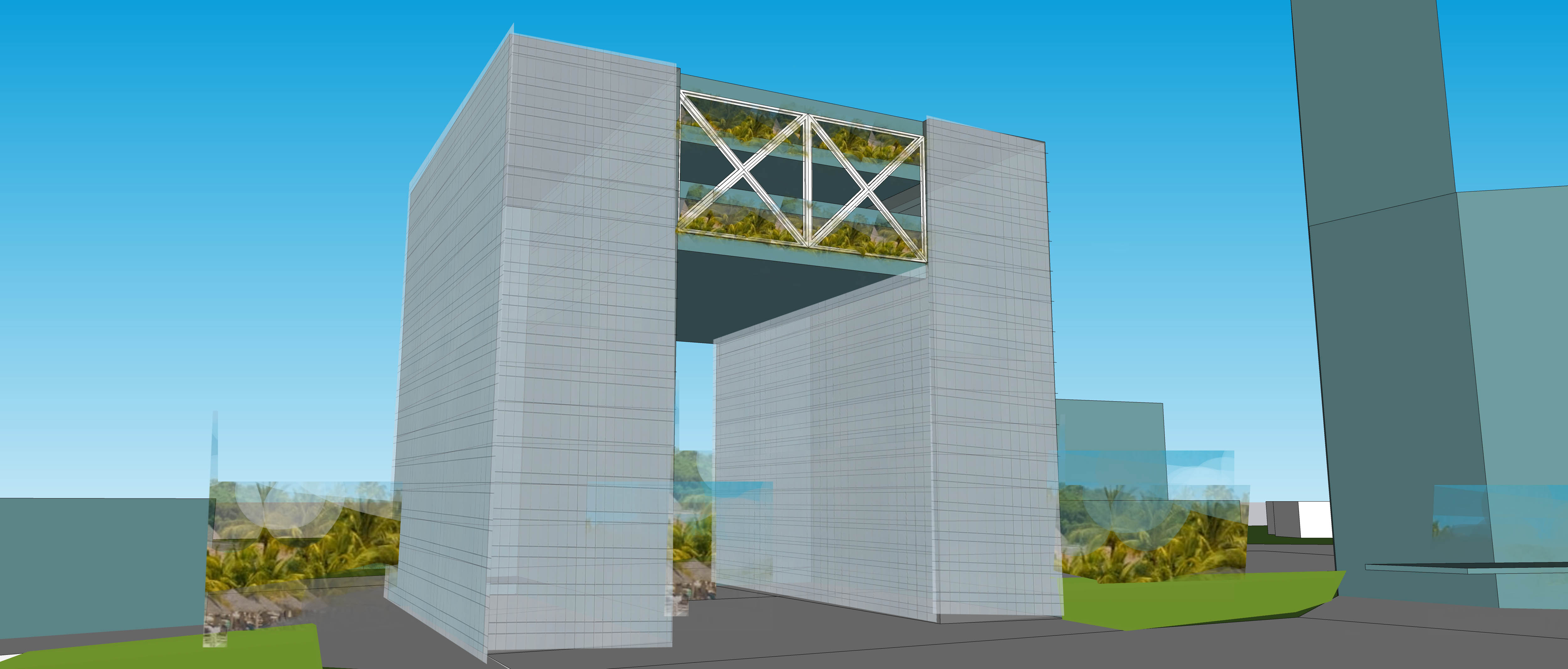 it is a a modern office building in a tropical country tanzania the building is 15 floors high the glass is not reflective is clear more transparent and has a whiter tone the vertical rectangular glass panels allow us to see people inside the lobby curtain wall has a different pattern from the rest of the building and the interior shows more activity including many people and hints of gastronomic venues there are many people entering and exiting the building under the elevated structure there is more activity with additional people who resemble typical tanzanian individuals as the scene is set in zanzibar the plaza floor is not smooth it is a light colored pavement with various patterns the grassy areas include diverse plant species the overall atmosphere is slightly ethereal but less so than before the residential building on the right is slightly shorter and part of another residential building can be seen on the left behind the main building a boulevard is visible with cars bicycles and many people walking and enjoying the area