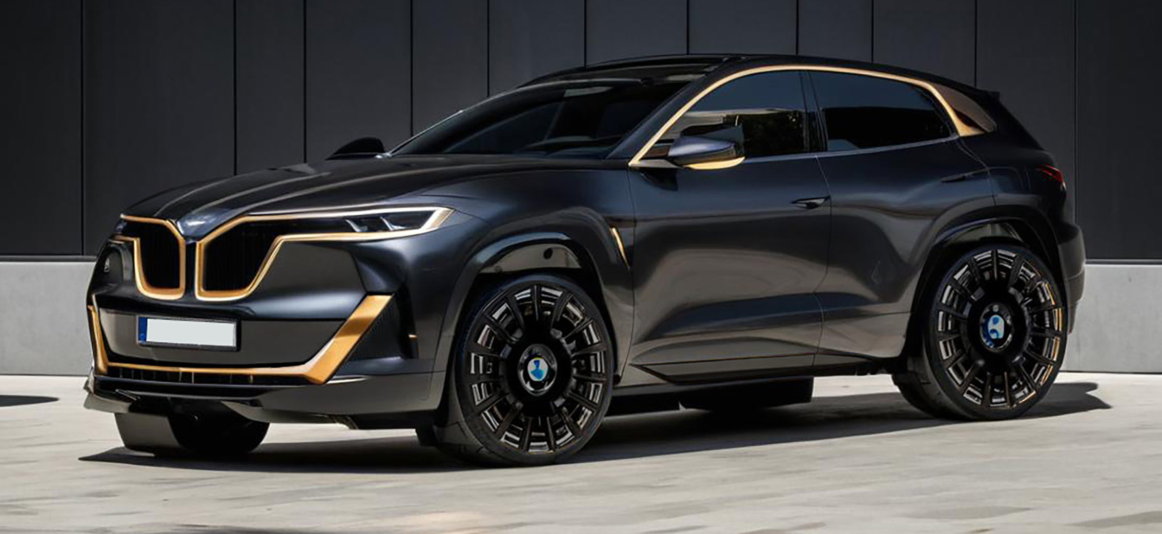 modernist exterior shot render a sleek futuristic suv with a glossy black exterior accentuating its unique design the wheels should be metallic black create a modern urban backdrop with sleek dark toned architecture and a smooth reflective surface under the vehicle capturing a sense of elegance and sophistication iconic glow strip of the front grill the atmosphere should be dynamic and vibrant highlighting the vehicle s luxurious and innovative appearance background should be a segment of santiago calatrava building architecture