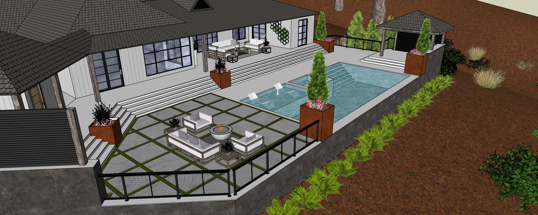 create a photo realistic rendering of this sketchup model showing the pool wall and other features of a residential hardscape