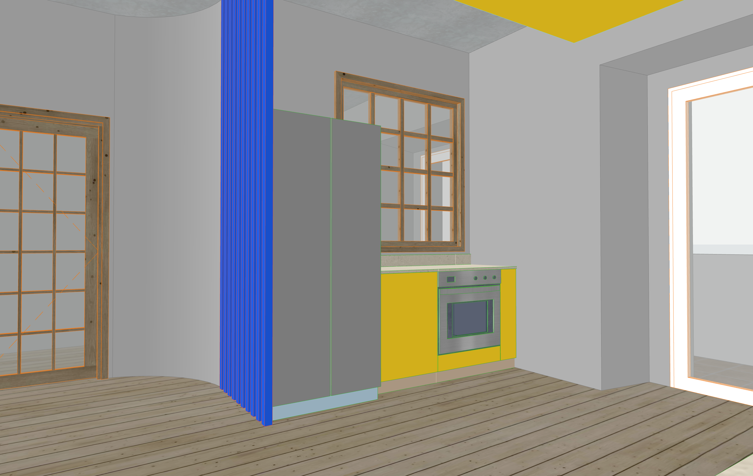 realizza una immagine fotorealistica agli elementi blu applica materiale legno rovere non modifcare altro