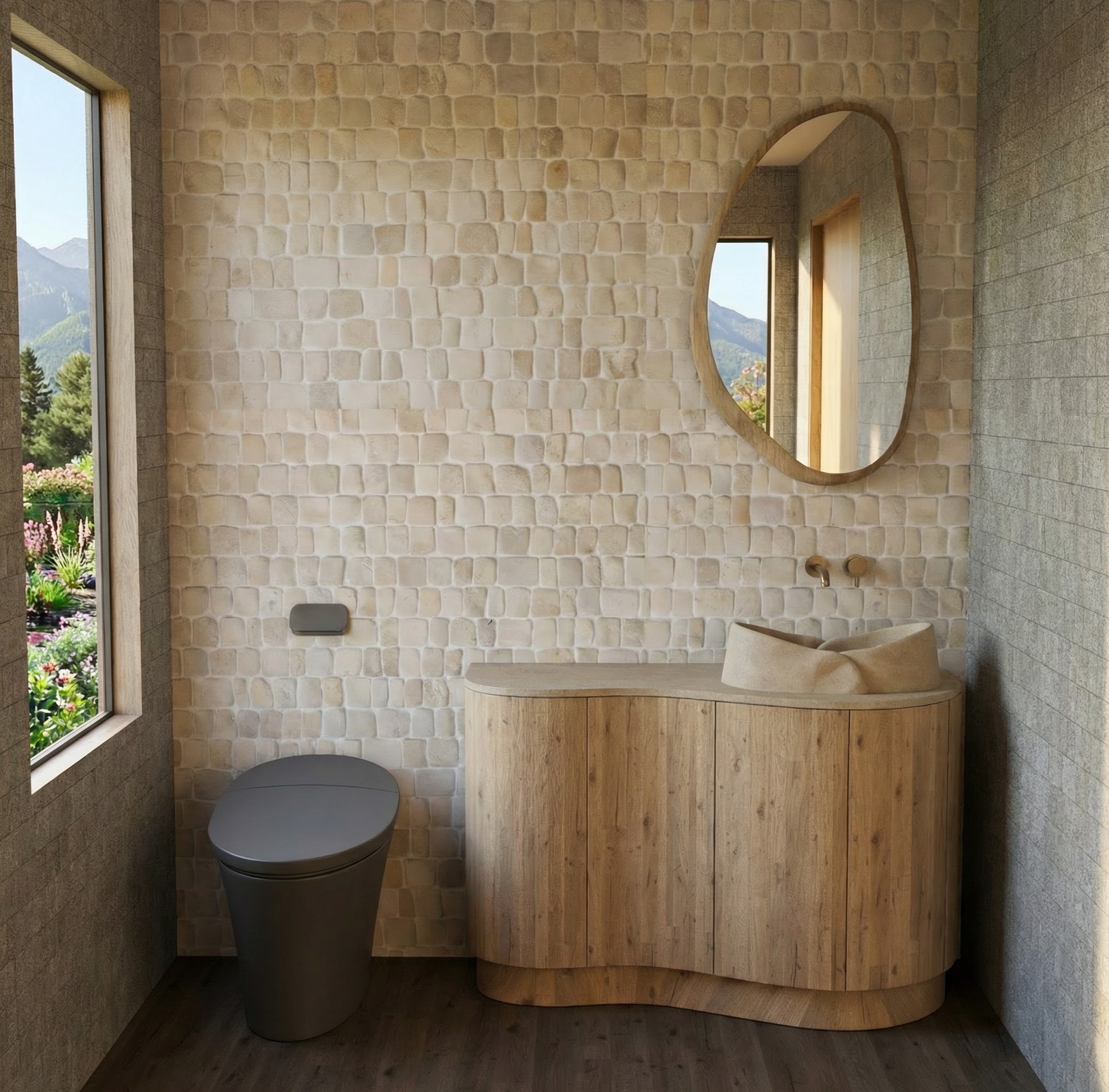 render this at 8k resolution changing the toilet model to a white one and wall mount with a flush plate in brass on the wall change the floor to the same color tone as the vanity keep everything else as is