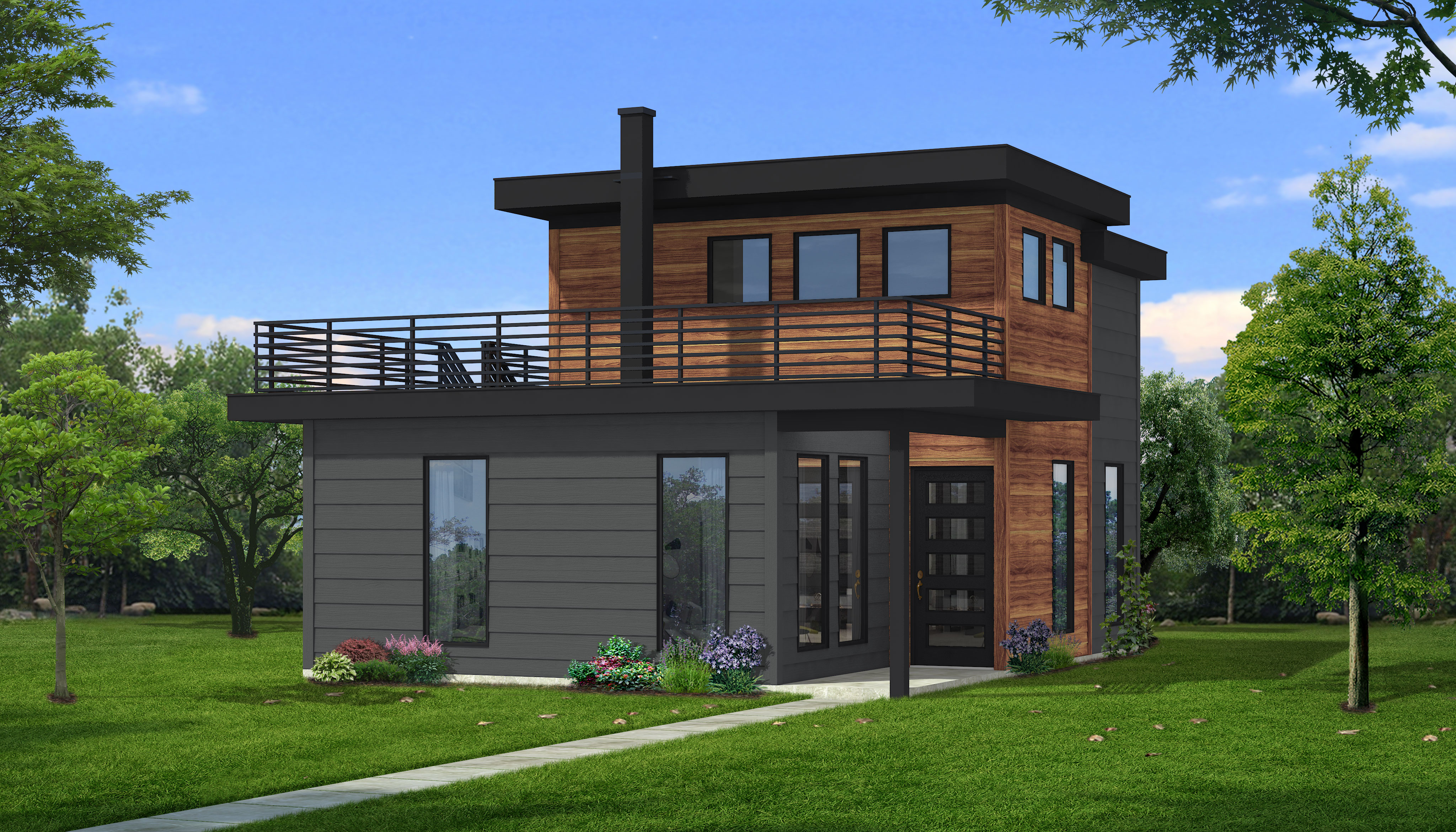 spring time late afternoon black frames trees more realistic at the background show different height of trees inside the buildings show furniture the windows are darker the lights in landscape should be realistic and metal material cedar wood horizontal siding dark gray metal 100 strength flowerbed along side of home