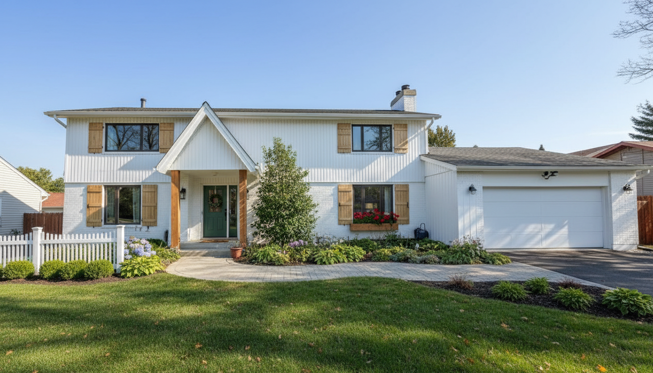 remove the front fence replace second story exterior with wide paneled board and batten painted white keep 1 story white brick