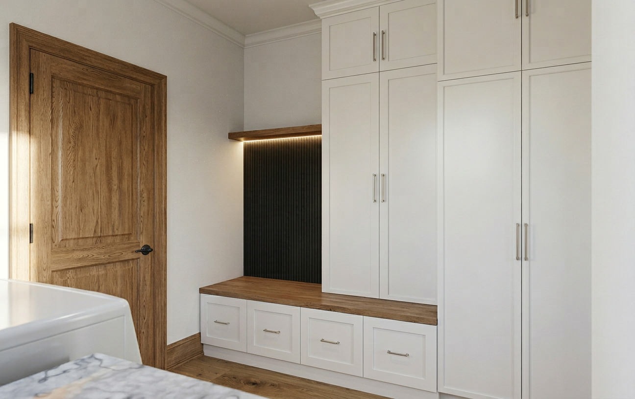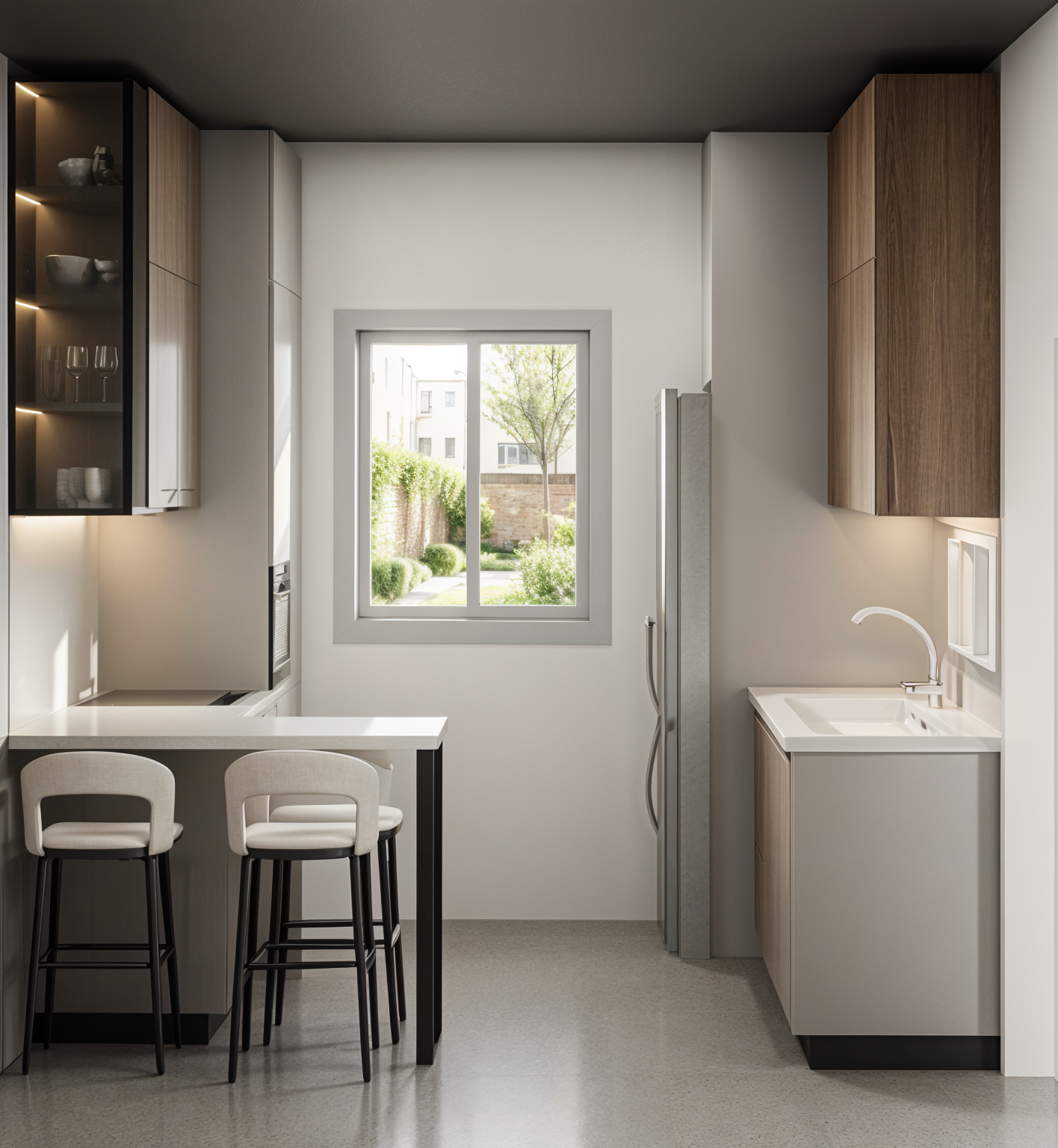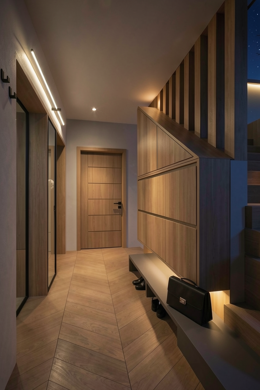 create a modern elegant office hallway featuring sleek elevator doors with a soft white finish the walls are gracefully adorned with a light stone texture exuding sophistication the ceiling showcases linear led lights casting a gentle glow over the space a dark charcoal carpet runs down the center contrasting beautifully with the off white tiles of the floor the wooden accents around the doorway add warmth while the glass door at the end reflects the ambient lighting creating an inviting and polished atmosphere