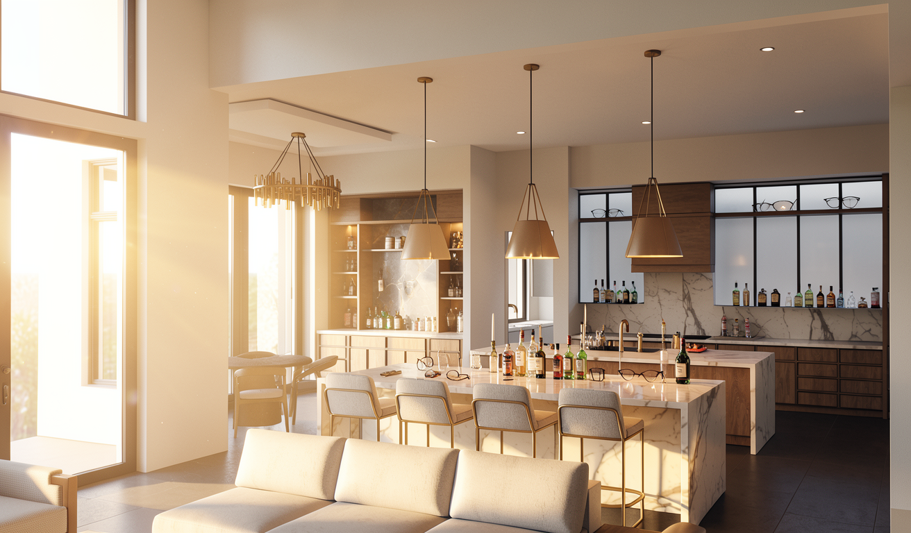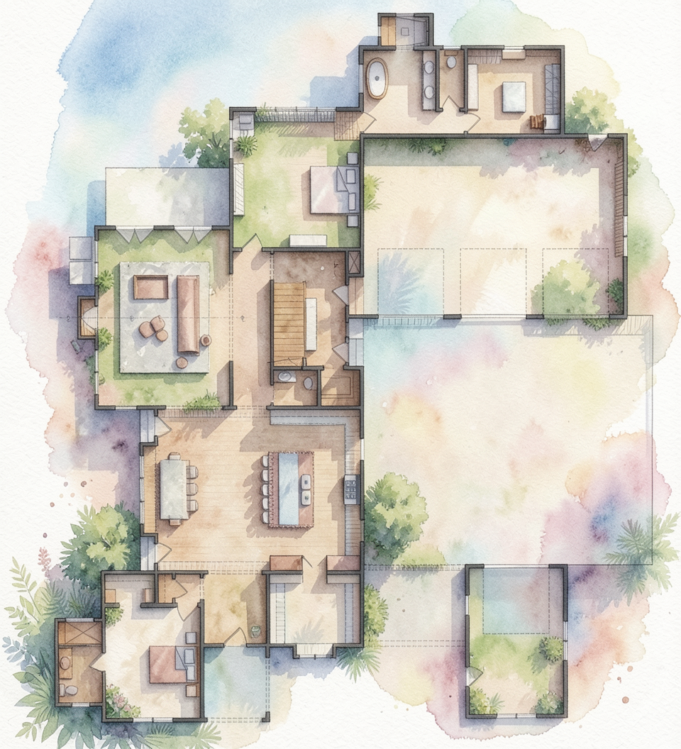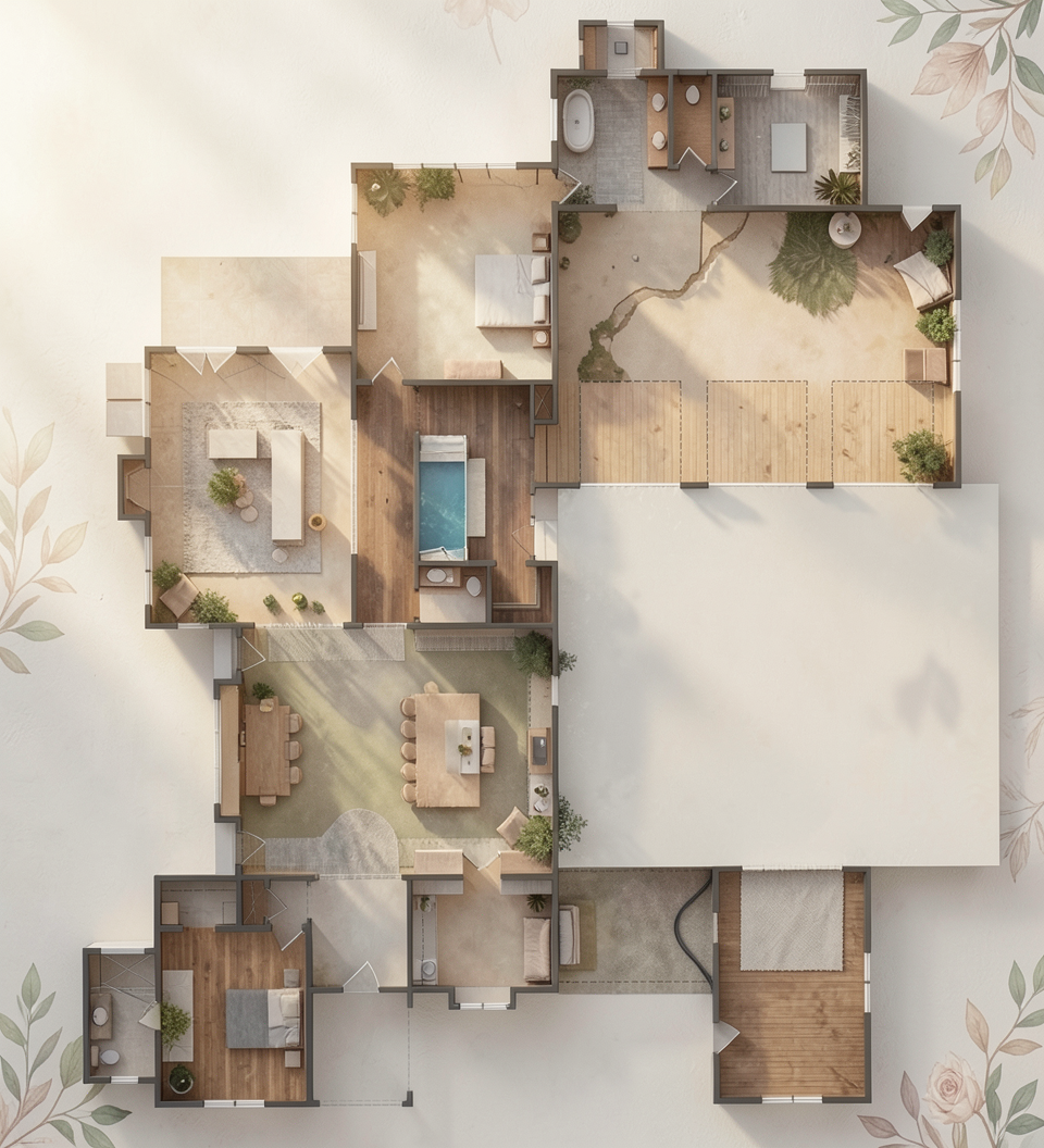 keep the pergola structure pool house kitchen layout and camera angle exactly the same do not change proportions or scale kitchen should run on left with a island across from it dining should feel very restoration hardware luxury outdoor seating and entertaining obvious with dining seperate clean up landscaping very important remove excess greenery and landscaping do not create full planting beds or natural garden areas instead use minimal intentional greenery only in large architectural planters planers controlled architectural place large cast concrete planters only at key structural points at pergola posts near corners of the space clustered in small groups 2 3 max per area planters should feel collected intentional sculptural use olive trees ornamental grasses simple structured greenery do not fill the entire perimeter with plants left side pool relationship critical keep the left side of the pergola clean and open suggest the presence of a pool by a clean linear edge subtle reflection or water line minimal obstruction do not add planters or landscaping that block the pool edge right side add pool feature add a long linear pool or water feature along the right side of the pergola it should run parallel to the structure and feel modern and minimal keep it low profile and elegant kitchen island refinement keep the kitchen and island but refine them make the island slightly larger and more substantial ensure clear spacing between island and kitchen wall keep materials clean plaster concrete stone overall style reduce visual noise the space should feel architectural minimal luxury intentional not landscaped or garden heavy lighting finish keep warm natural light clean shadows neutral tones