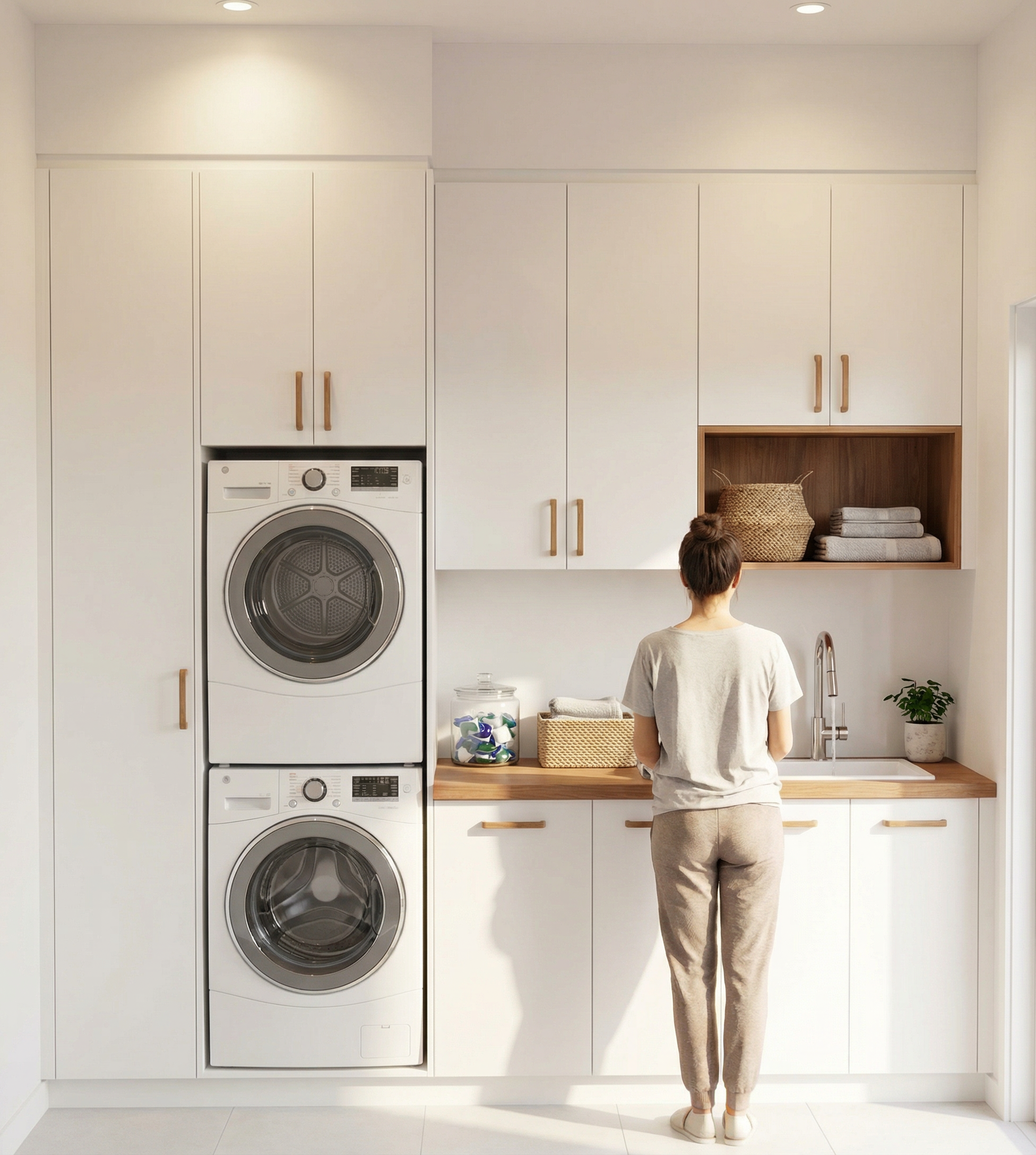 put downlights in the ceiling and natural light coming through to brighten the space add office decor books on shelves and printer on bottom shelf have someone grabbing a book off the shelf