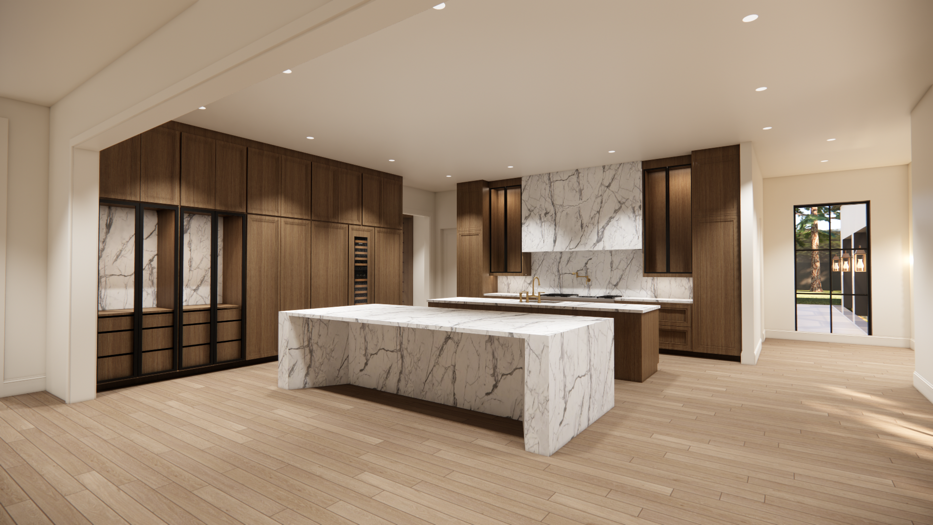 transform this kitchen rendering into a highly realistic editorial style architectural photograph while maintaining the exact original flooring color cabinetry color material selections layout and architecture do not change stain tones finishes proportions or design intent in any way the flooring msi mccarran herringbone ladson color must remain the same tone and pattern as shown simply enhance realism add authentic wood grain depth subtle tonal variation between planks natural matte finish with soft light reflection clean properly scaled herringbone alignment realistic shadowing between boards cabinetry must remain the exact same ladson tone and finish as originally designed improve realism only true white oak grain texture slight natural variation soft shadow lines at panel reveals accurate depth at doors and drawer fronts refined millwork detailing countertops and backsplash are taj mahal quartzite maintain the exact slab tone and veining direction as shown enhance natural stone depth realistic thickness and edge detail soft surface reflection subtle translucency and dimensional veining no exaggerated movement lighting is critical natural daylight entering from the right side windows light should wash across the floors and cabinetry realistic highlight and shadow fall toward the left balanced exposure with visible exterior detail no blown out windows soft ambient interior balance photography style luxury real estate editorial aesthetic full frame dslr 35mm lens eye level perspective straight vertical lines no distortion crisp focus with slight depth of field natural color grading do not add or remove furniture decor appliances or architectural elements only enhance material realism lighting accuracy and photographic quality overall mood refined high end luxury kitchen listing photography