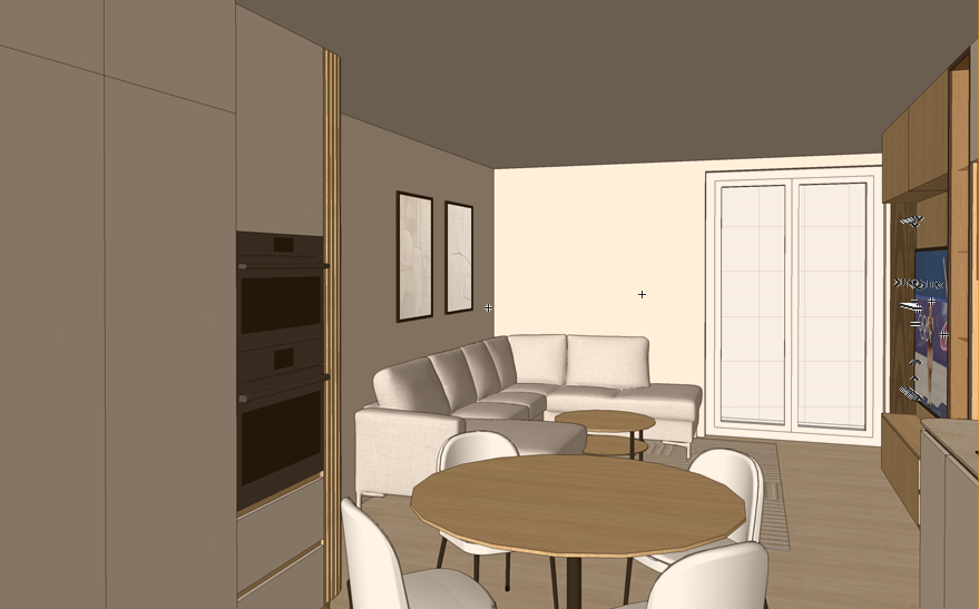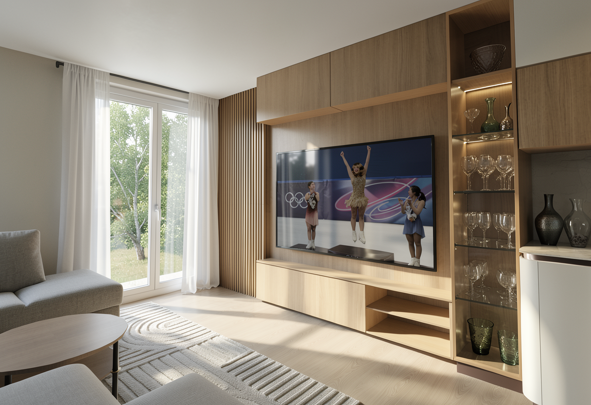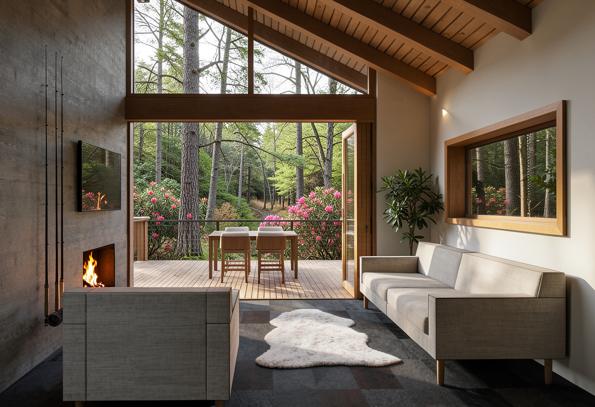 render a realistic interior visualization install light sheer white curtains on the window outside the window trees should be visible use soft subtle lighting with limited direct sunlight creating a calm and natural atmosphere