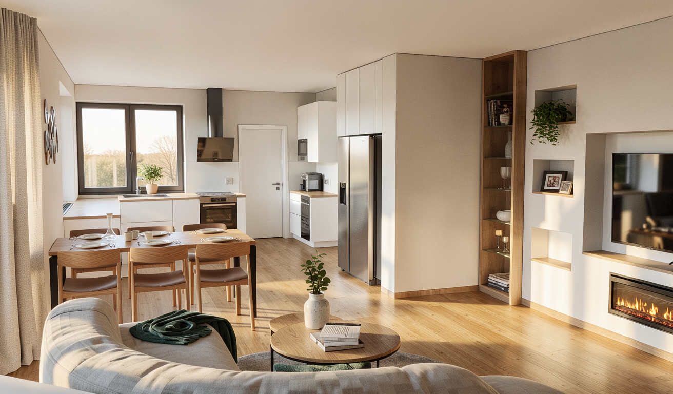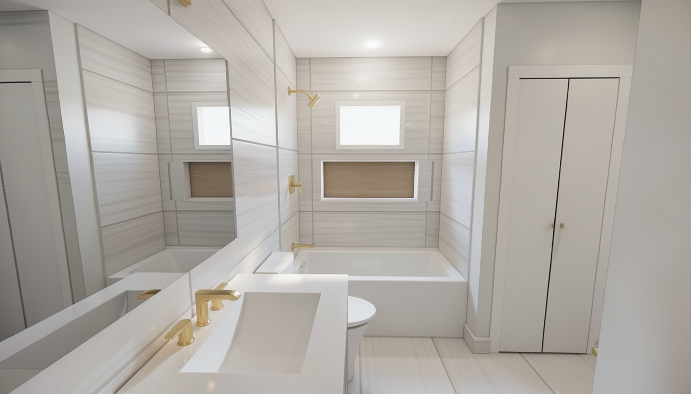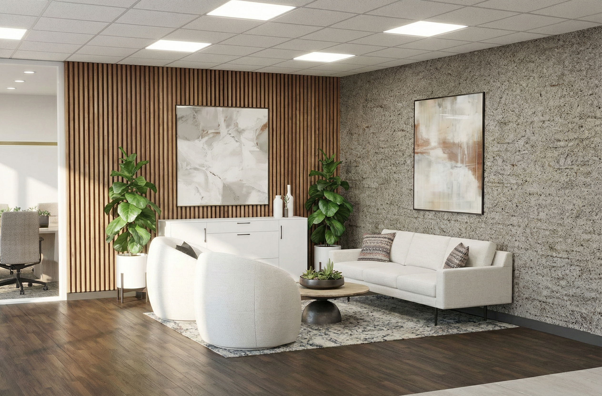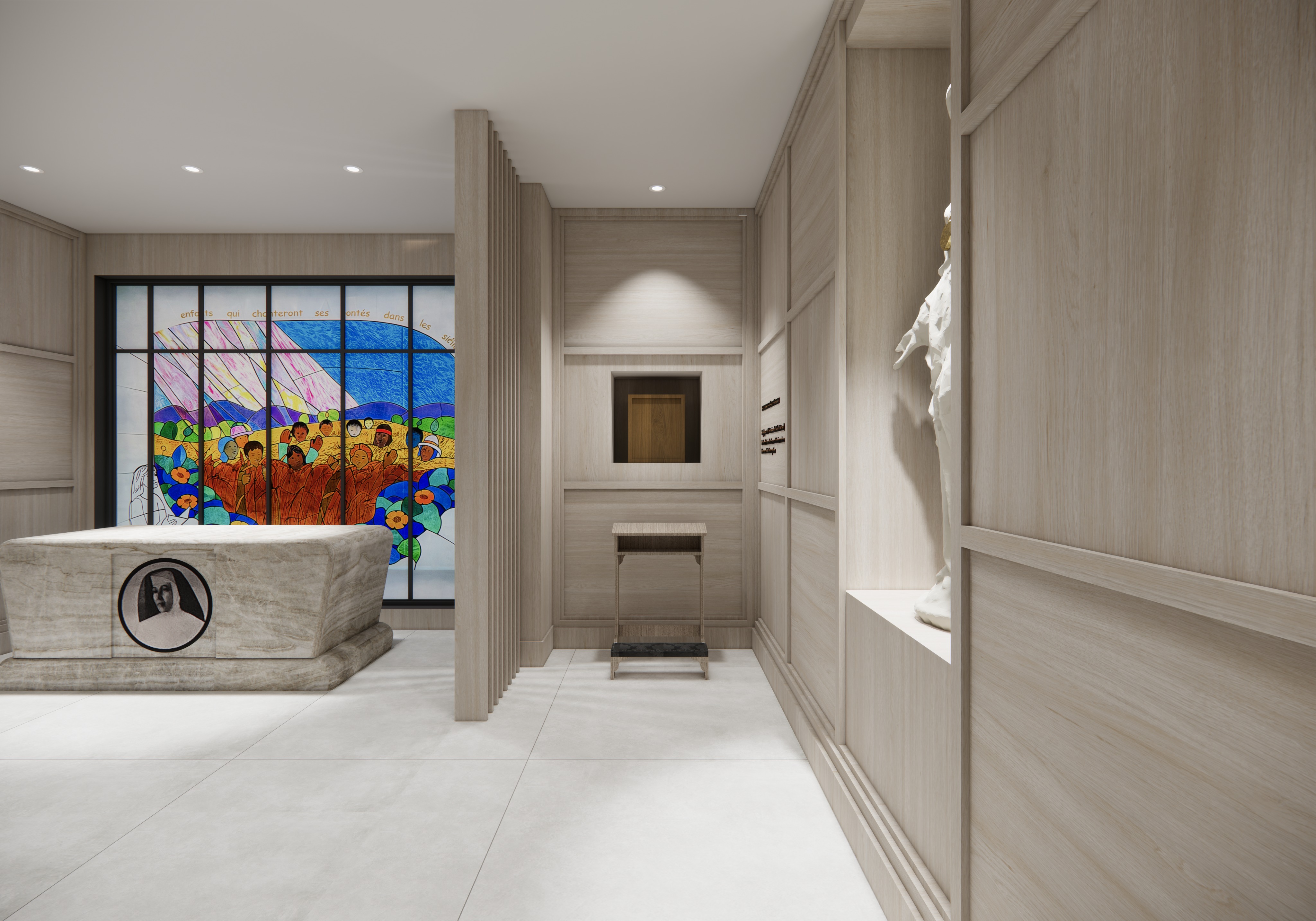 create a render in hyper realistic architectural visualization quality 8k resolution all objects furniture and architectural features must remain in place do not add any objects or delete anything from the image and let natural light in through the stained glass window in the back