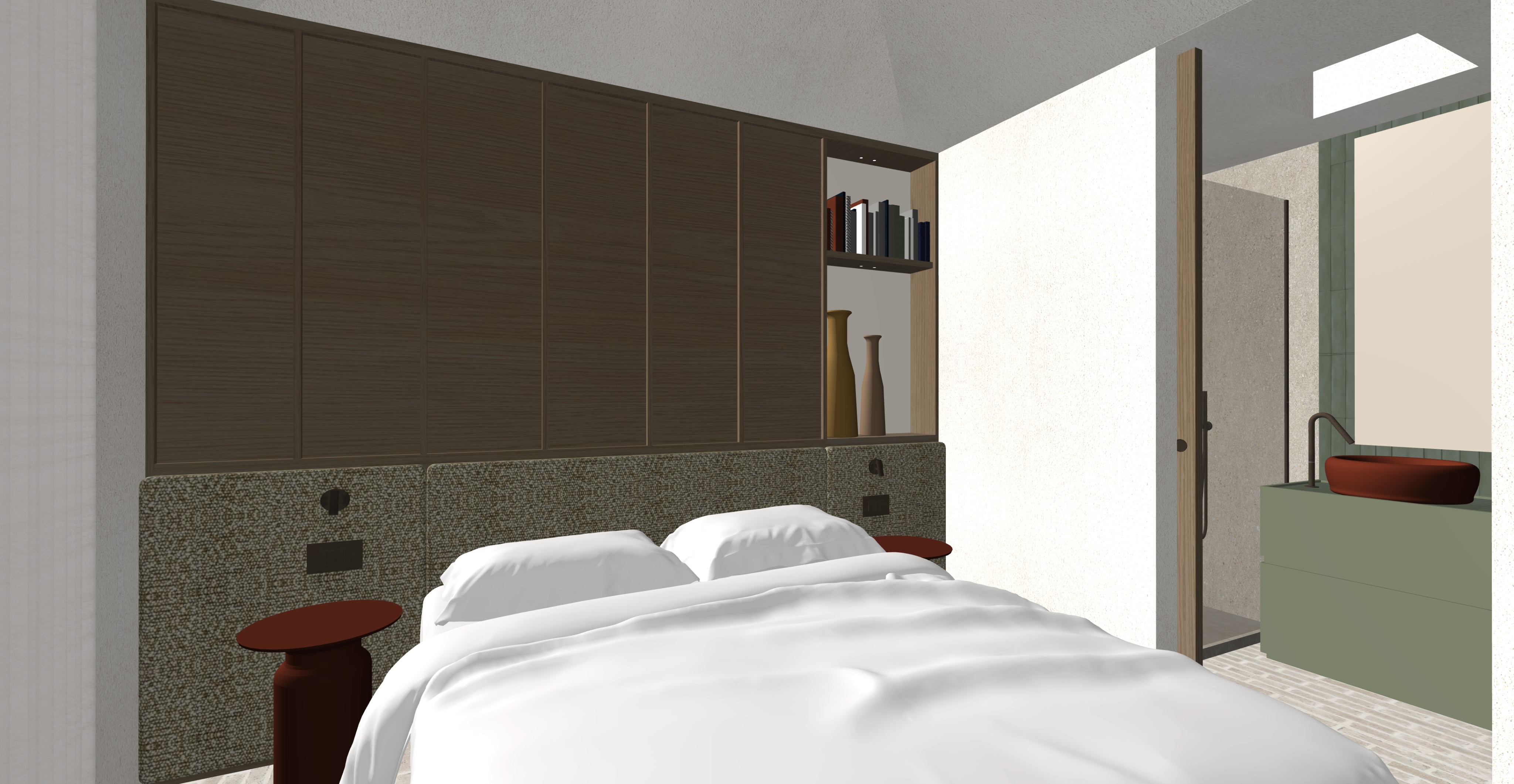 le pareti sono intonacate bianco caldo intonaco con texture come muri esterni mantieni tessuto testata letto specchio ambrato dietro nicchia libri e vasi comodini laccati lucidi rosso ruggine scuro luci lettura con finitura metallo marrone accendi micro faretti dentro nicchie