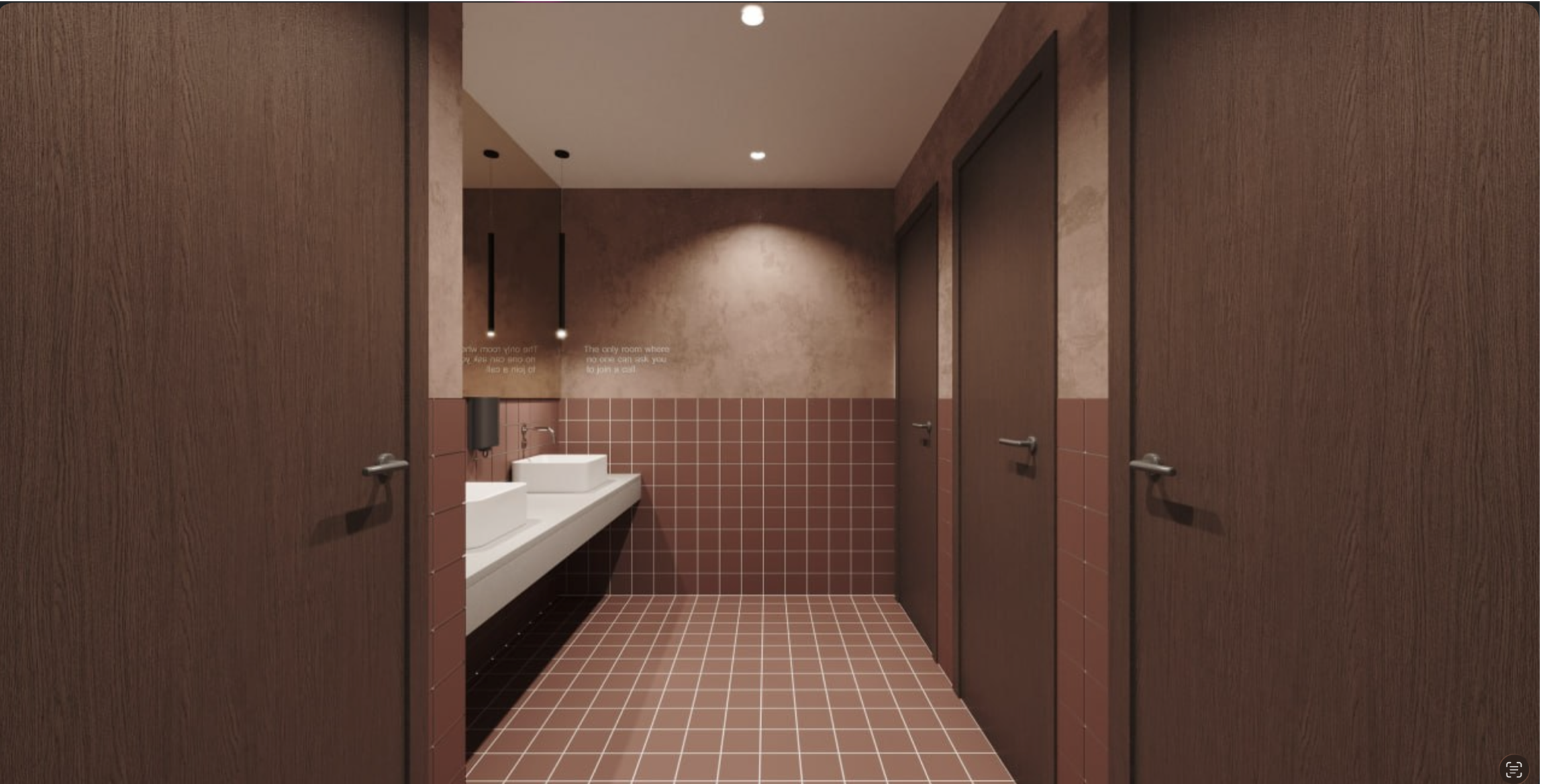 keep the existing space architecture interior elements on the same space action adjust the colour of the red mortex wall make it softer less saturated but not too pink beige tones adjust the colour of the mirror make it less brown less saturated lighter and brighter change the mending lamp by a n d column 300 verticaal 2 units hanglamp